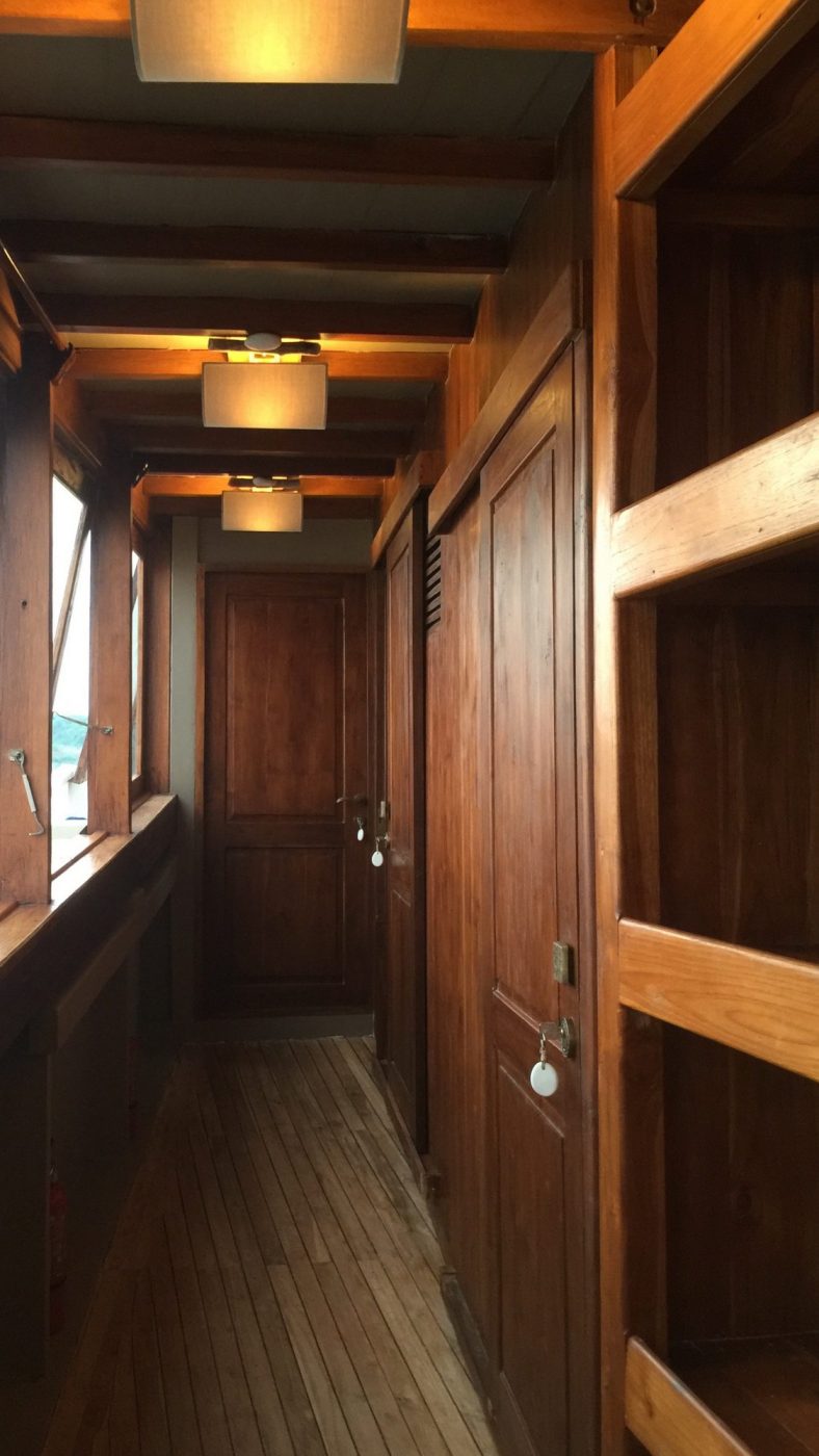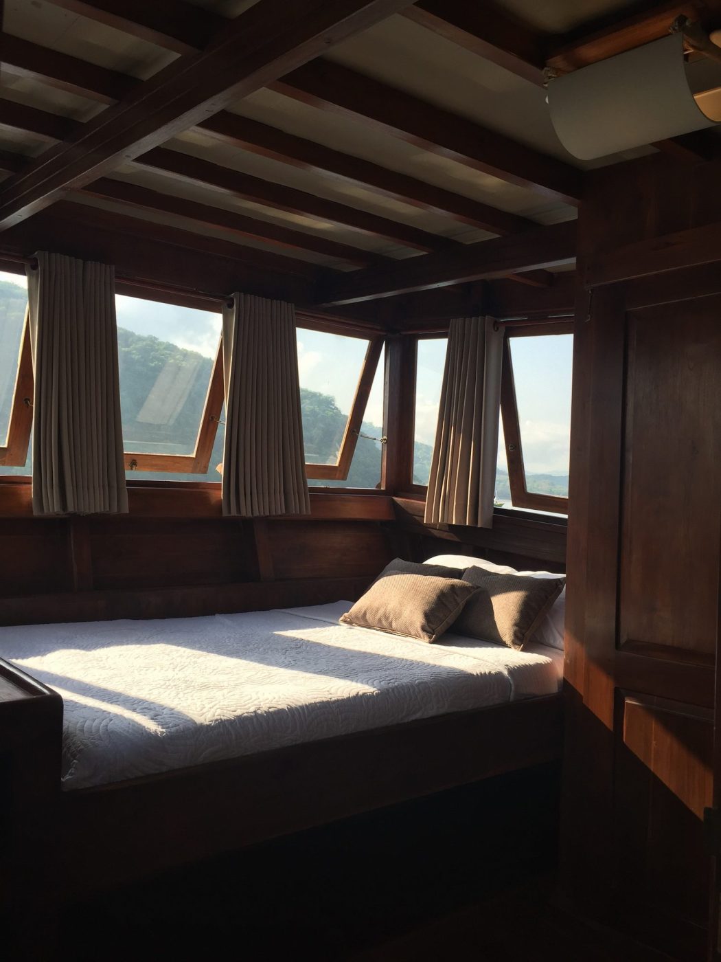 The interiors encourage generous space and ample natural light. The seven newly refitted air-conditioned Indonesian teak double cabins sleep up to 14 passengers; 4 cabins are located on the main deck, 2 cabins are on the lower deck and 1 cabin is situated on the upper deck, revealing panoramic views through large windows. Each room has a private bathroom with a hot water shower.