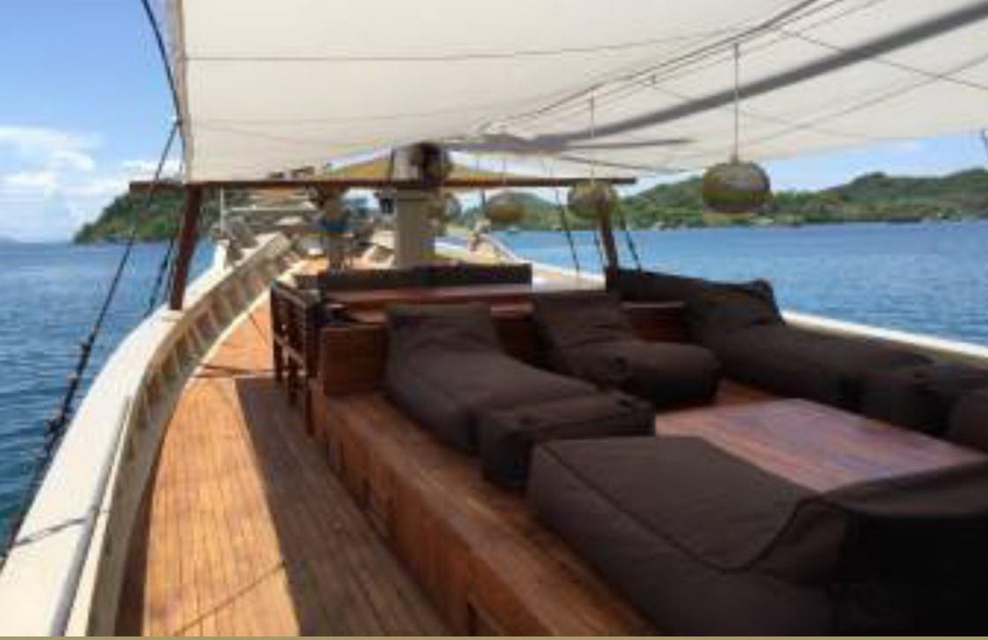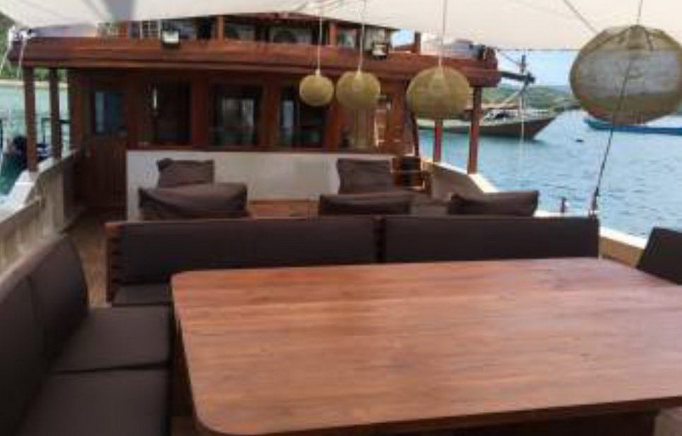 Two open decks function as spacious living areas. Numerous comfortable sunbeds invite guests to relax, have a drink, soak up the sun or just sit back and enjoy the cruise, its reef and surrounding islands. The main deck has a large outside dining table, where guests can indulge in traditional Indonesian as well as quality western food, cooked by the knowledgeable chef.