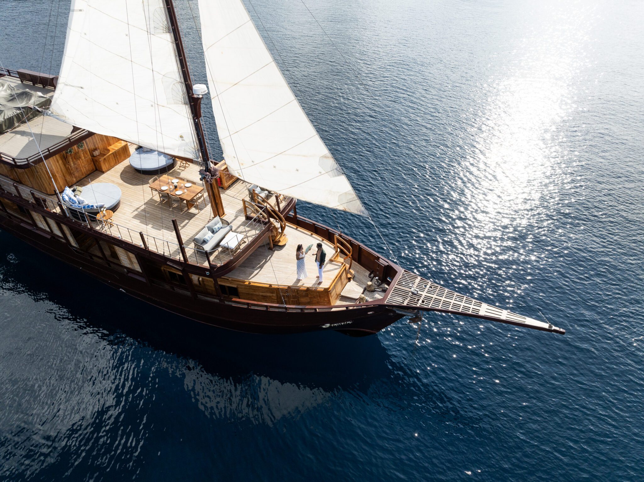 Completed in 2017, Sequoia is a modern take on the classic wooden yacht. Named after the giant Sequoia tree, one of the oldest living organisms on earth, this handcrafted yacht was designed as an heirloom vessel for generations of families to enjoy. Using traditional, Indonesian Bugis boat construction, the hull and super structure are comprised or Ironwood and Teak. The interior fittings and mechanical components are integrated into a state of the art American engine room and electrical power systems. Custom designed light fixtures illuminate the night sky and the underwater lighting allow you to see some of the magic below. With Sequoia, East meets West with modern, custom-made amenities, melded with Indonesian tropical island beauty. You will be able to enjoy this remote island wonderland in complete comfort.