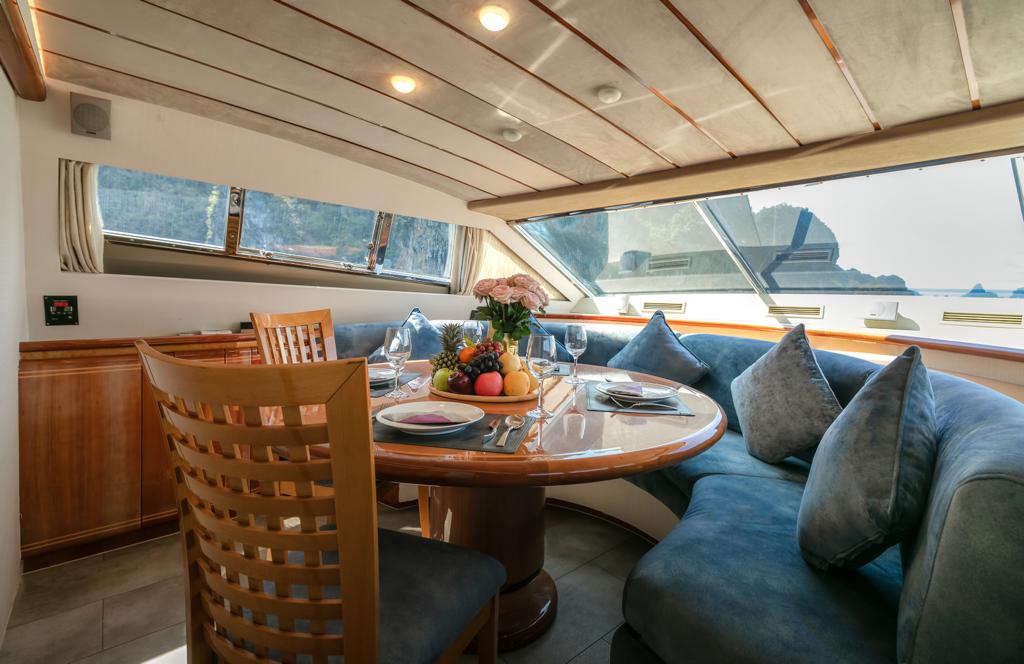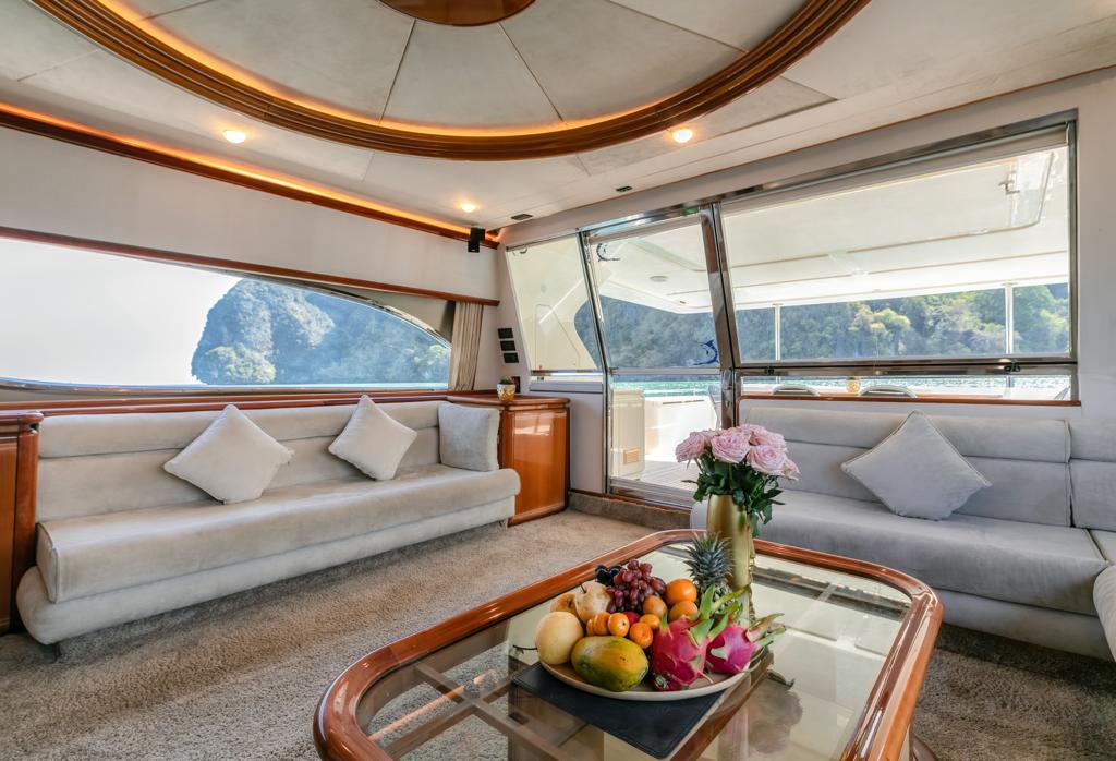 Crewed charter yacht, Ferretti 80, features a contemporary elegant interior, of warm cherry wood panels, neutral soft furnishings and a light airy atmosphere. The salon is spacious offering a large U-shaped sofa, opposing love seat, coffee table and state-of-the-art entertainment. Surrounding windows infuse the salon with plenty of natural light. Forward of the salon in a raised position, is the formal dining table seating 8 guests with ease. Below decks are 4 guest cabins, for up to 8 guests. She is fully air-conditioned throughout, boasting optimum comfort.