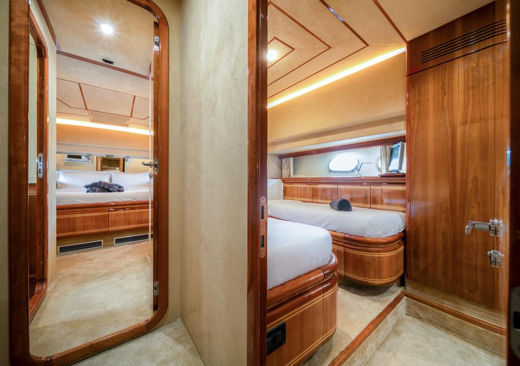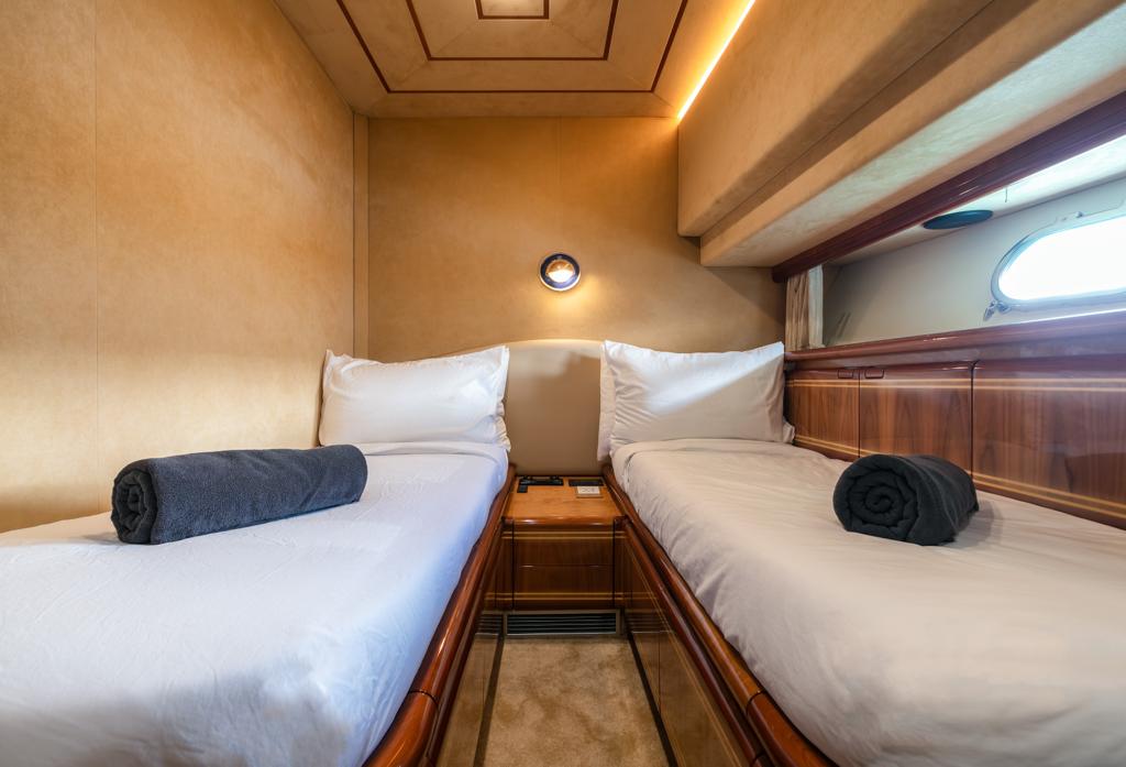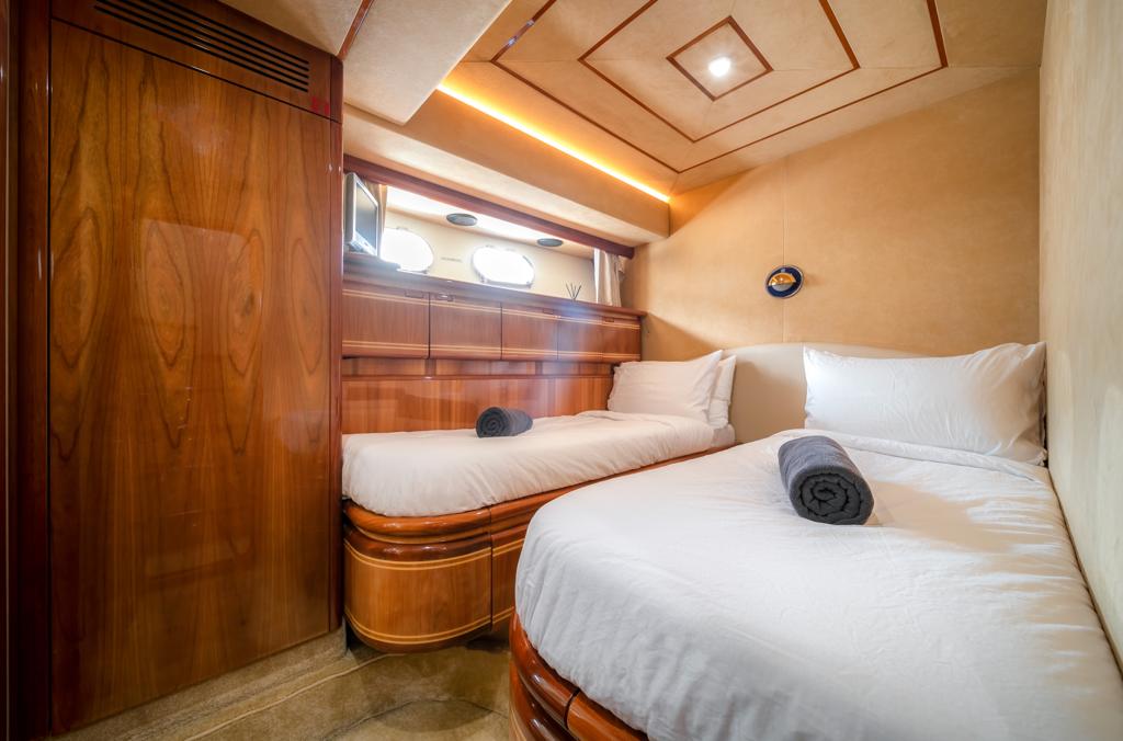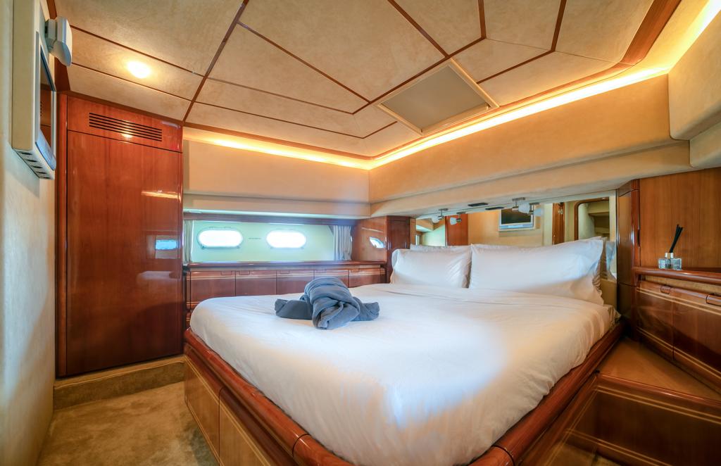 The luxury Ferretti can accommodate up to 8 guests, in 4 spacious cabins. The master stateroom spreads the full-beam of the yacht amidships, with a centre-lined king size bed, sofa and vanity, the en-suite is well-appointed and boasts a bathtub. The VIP cabin is forward and full beam of the yacht, with a centre lined queen size bed. Two guest cabins each have twin single beds. The master and the VIP cabin offer private en-suite facilities, audio and TV entertainment. The Twin cabins have shared facilities and offer audio entertainment.