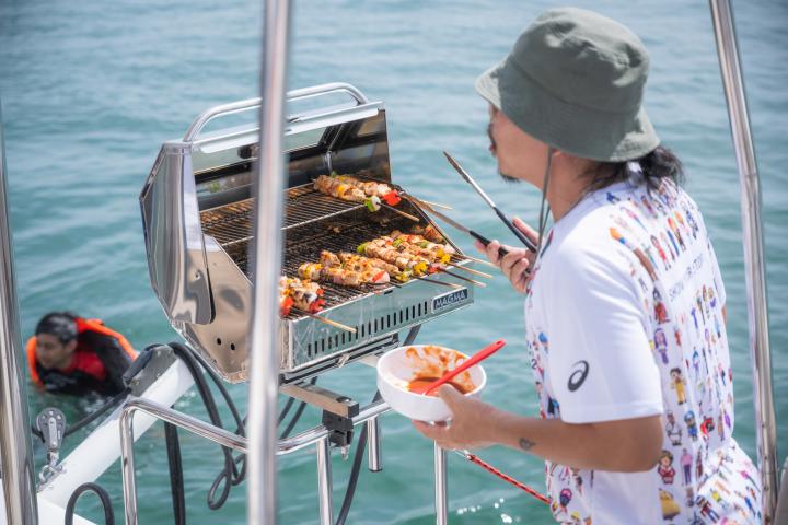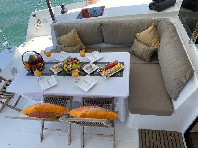 When you enter in to the spacious salon area you will notice the abundance of natural light from the surrounding windows together with the opening hatches to provide plenty of ventilation for the warm tropical days. The boat has a blue tooth sound system with can be controlled both inside the saloon and on deck.