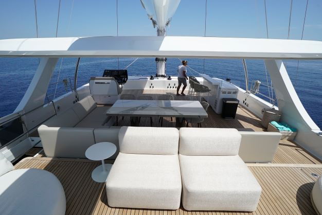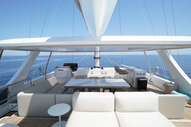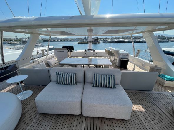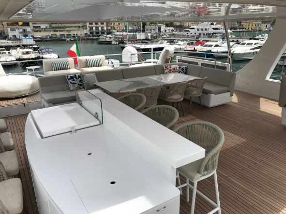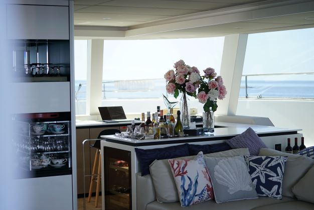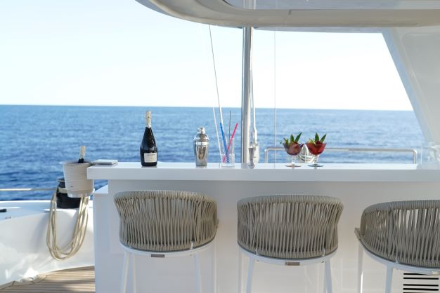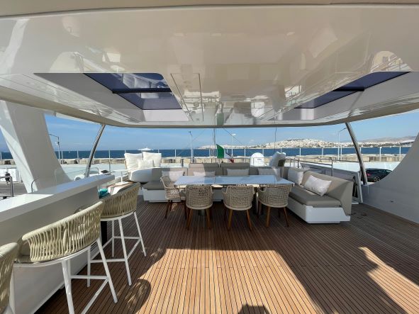 The Sunreef 80 is fully designed to give you access from the main lounge to every corner of the catamaran. Guests can enjoy the aft cockpit and the front deck which is also accessible through the lounge. The spectacular flybridge is a focal point for you to enjoy your yachting holiday in Greece. With a fully equipped bar, guests can enjoy sunbathing from a large sofa with space for all guests around the large dining table.