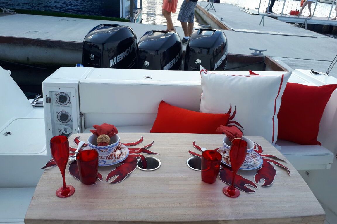 There is a berth in front for sitting underway or a shaded area for lunch while at anchor – with a big sofa bed for the sun worshipers.