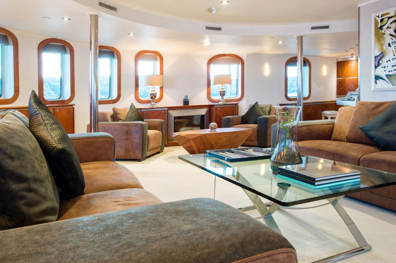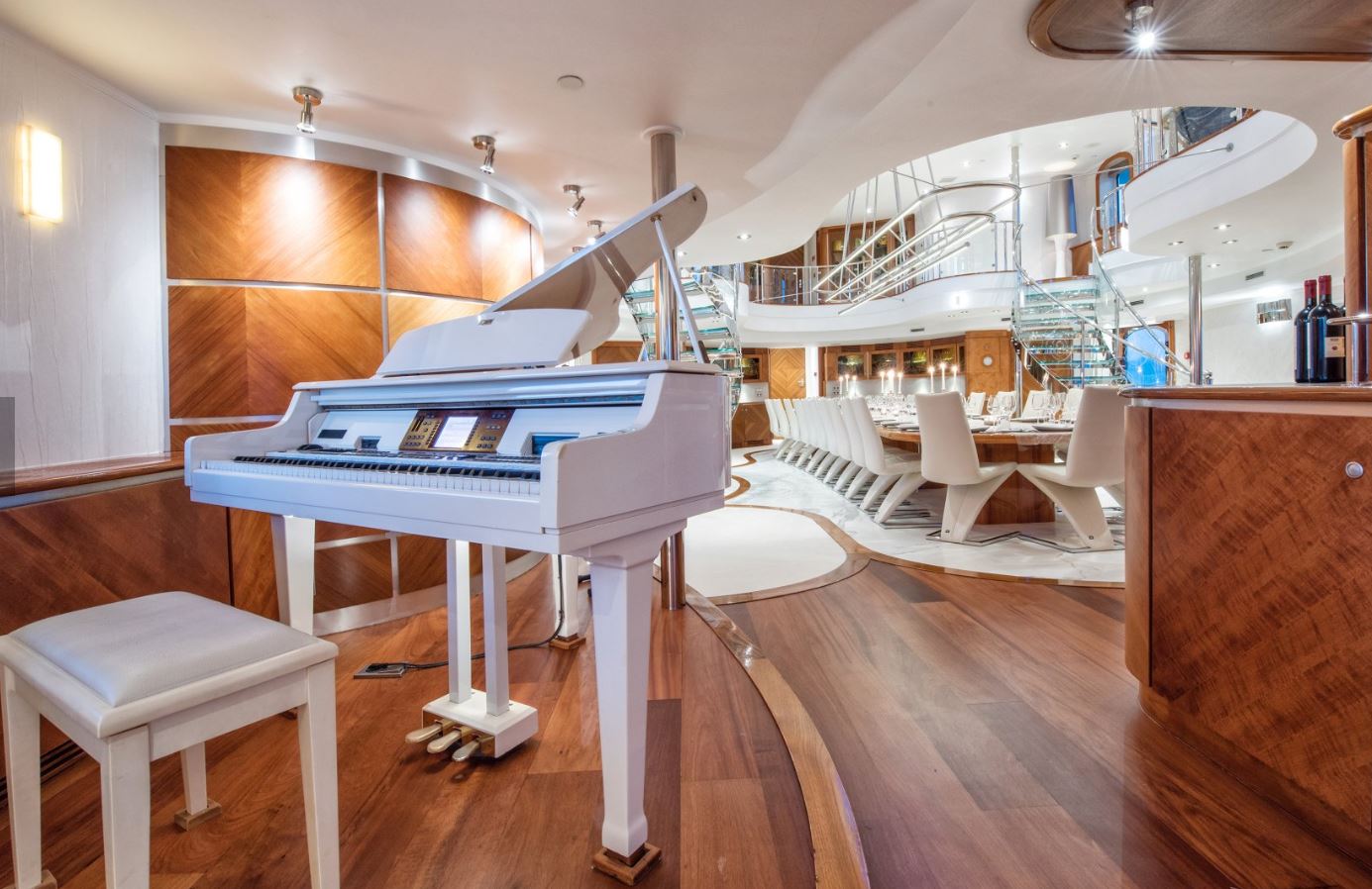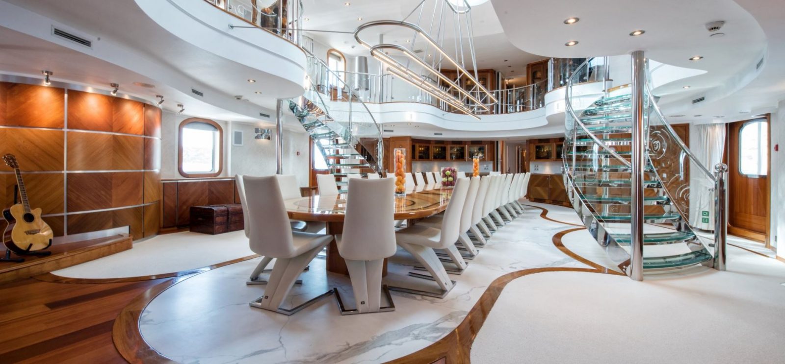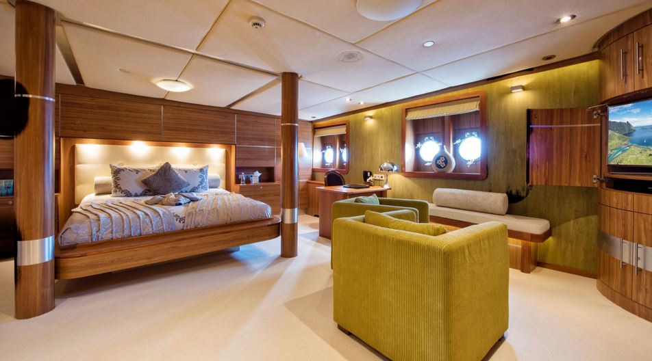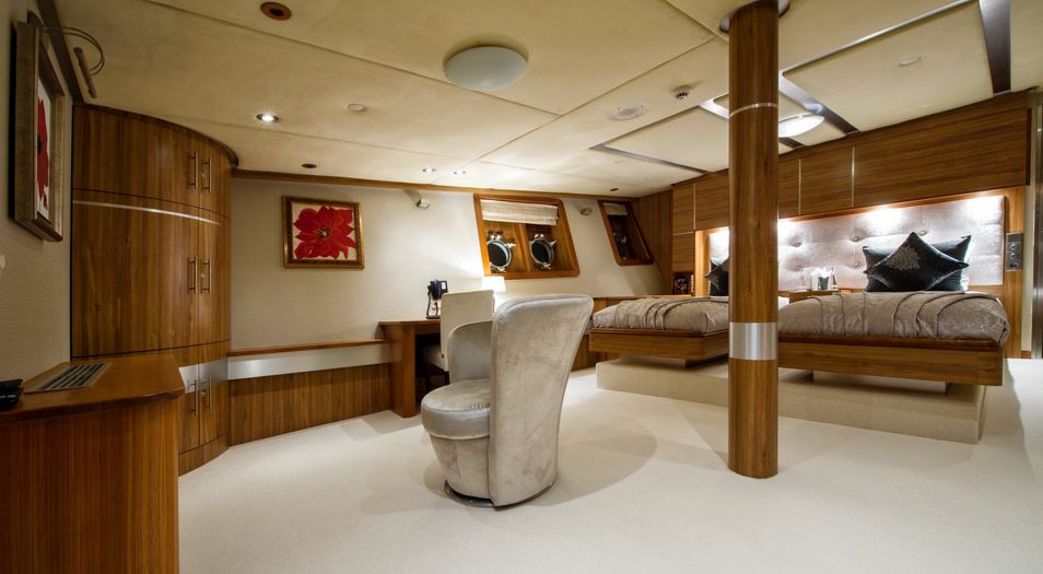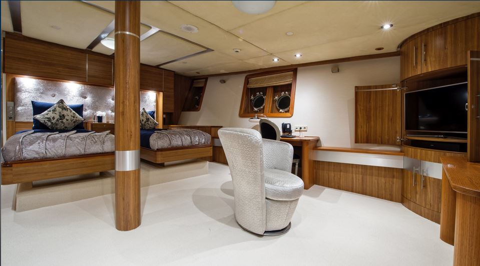 Few of her unique features onboard are such as the dining salon for all 26 guests sits in a colossal 7m atrium that is bathed in natrual light filtered down trhough the glass bottomed 18-person Jacuzzi above. She has a fully equipped SPA with gym facilities, indoor Jacuzzi, steam room and sauna, even a dedicated beauty salon/massage room with fully trained therapist onboard.