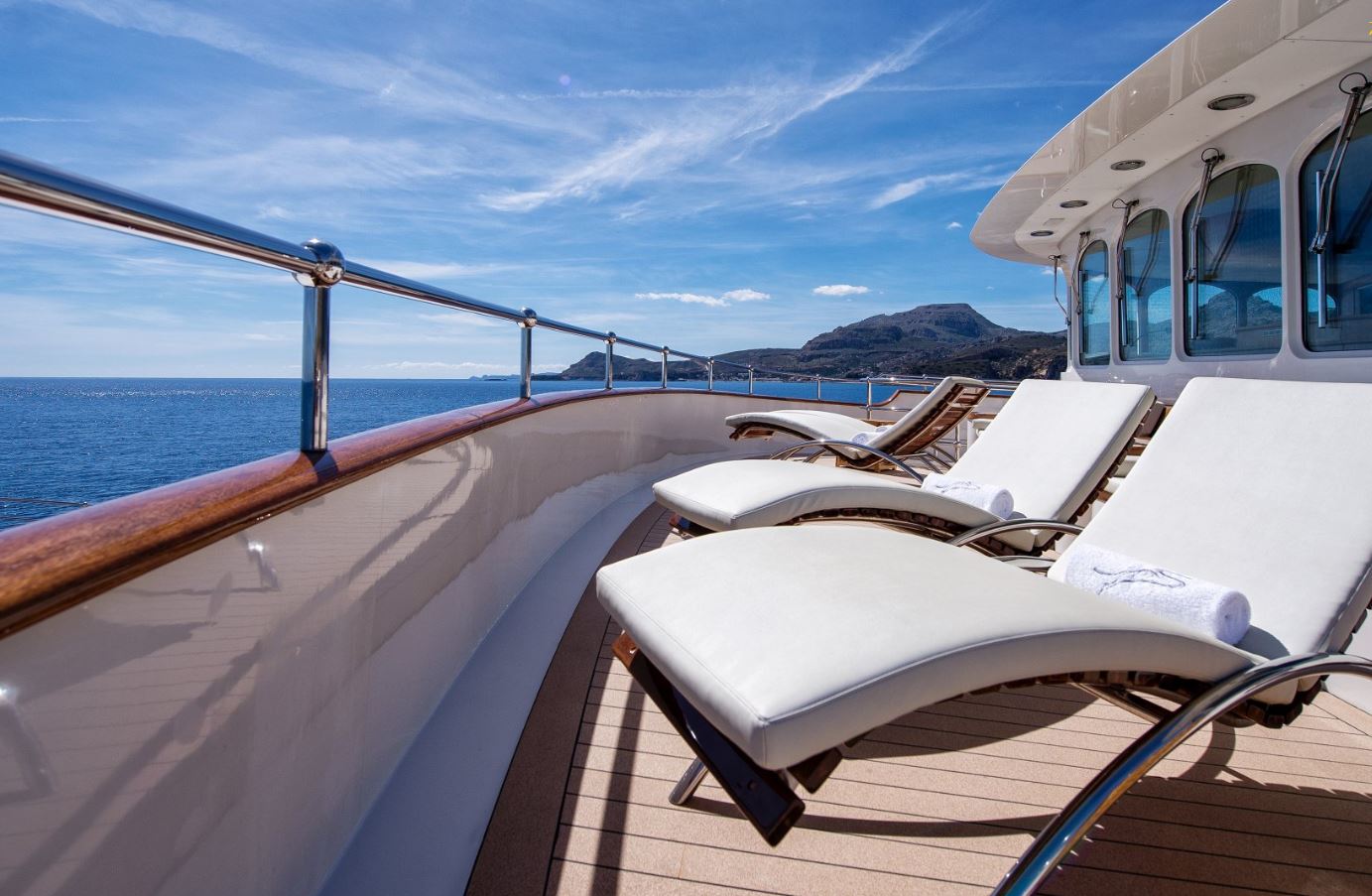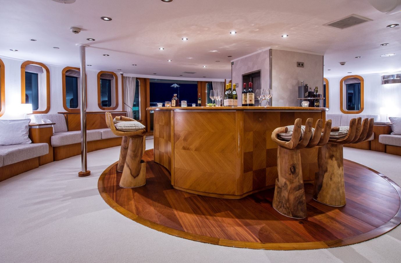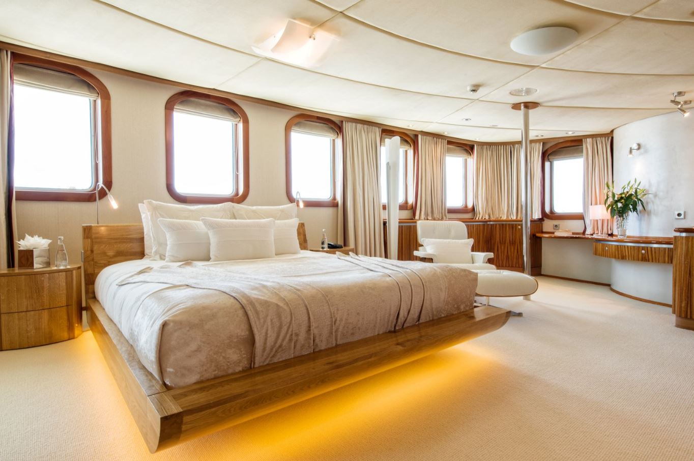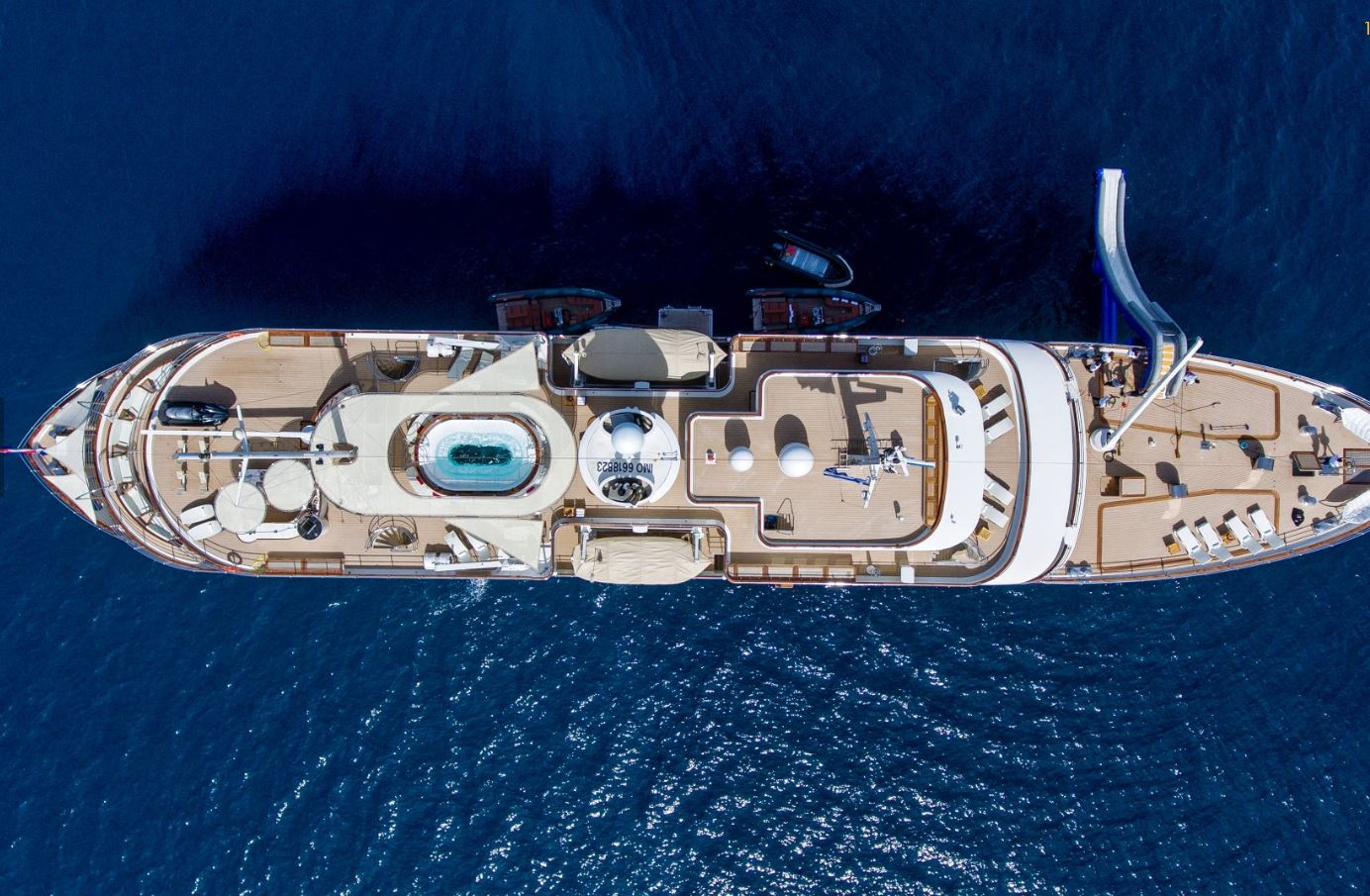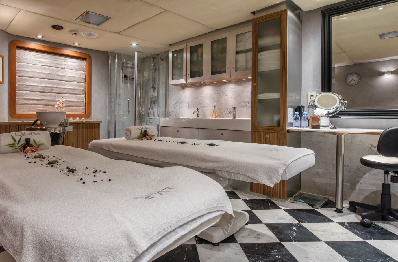Few of her unique features onboard are such as the dining salon for all 26 guests sits in a colossal 7m atrium that is bathed in natrual light filtered down trhough the glass bottomed 18-person Jacuzzi above. She has a fully equipped SPA with gym facilities, indoor Jacuzzi, steam room and sauna, even a dedicated beauty salon/massage room with fully trained therapist onboard.
