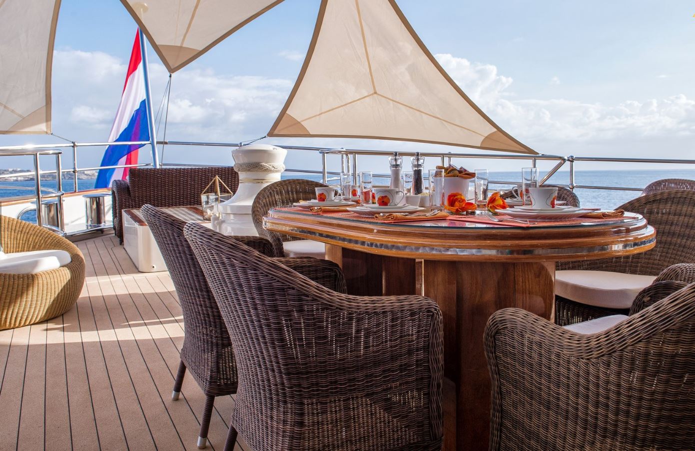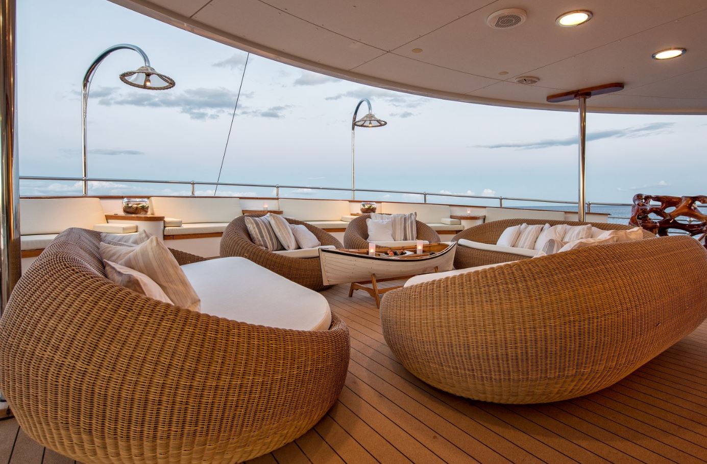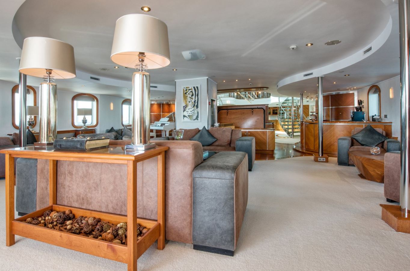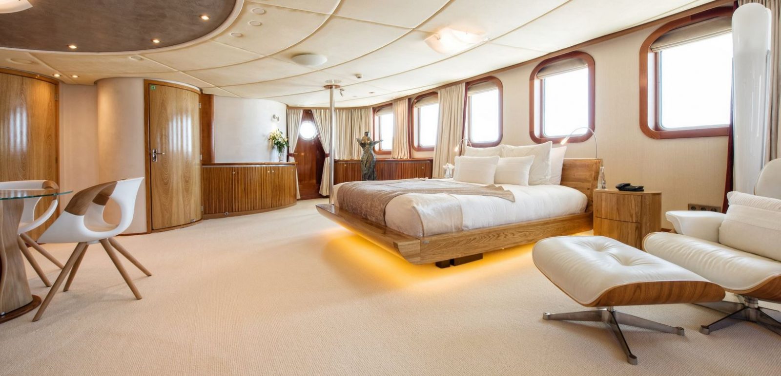 Few of her unique features onboard are such as the dining salon for all 26 guests sits in a colossal 7m atrium that is bathed in natrual light filtered down trhough the glass bottomed 18-person Jacuzzi above. She has a fully equipped SPA with gym facilities, indoor Jacuzzi, steam room and sauna, even a dedicated beauty salon/massage room with fully trained therapist onboard.