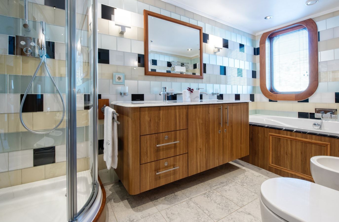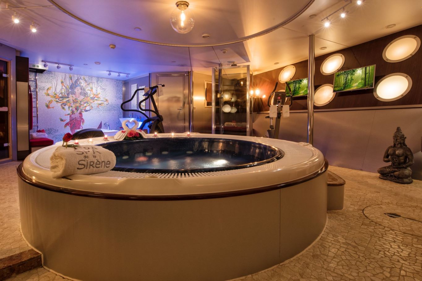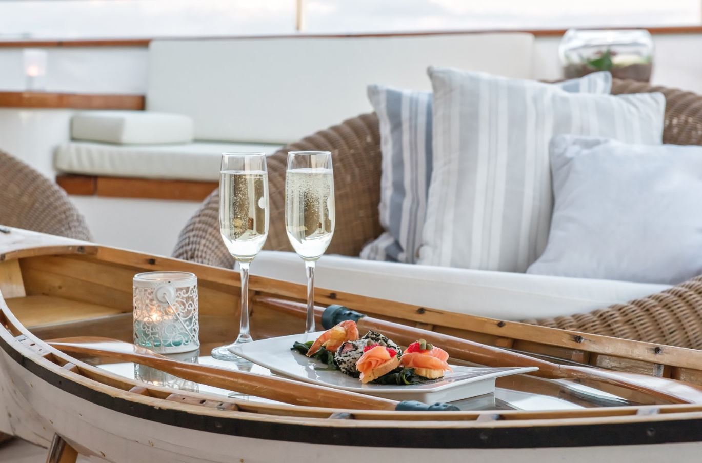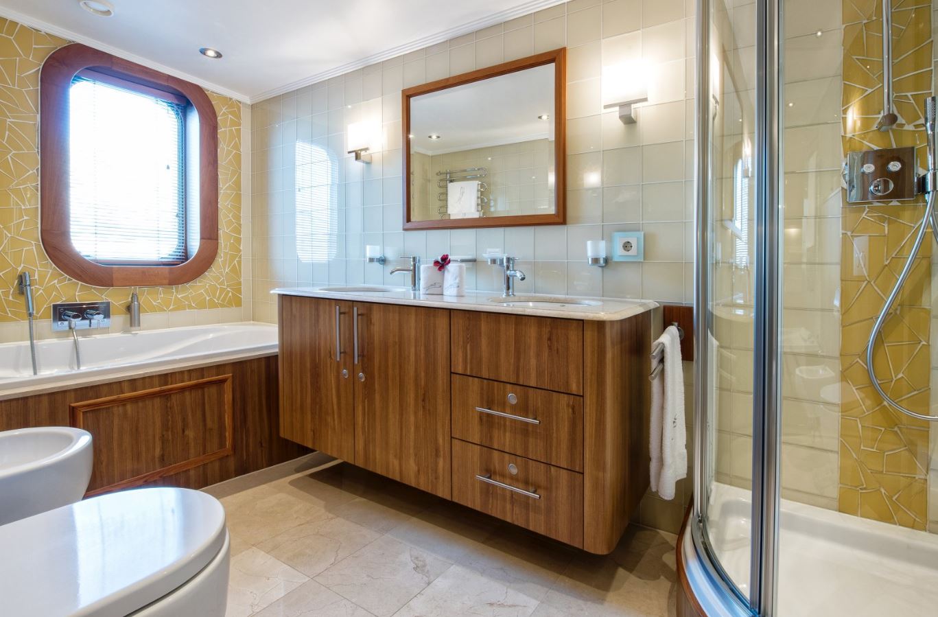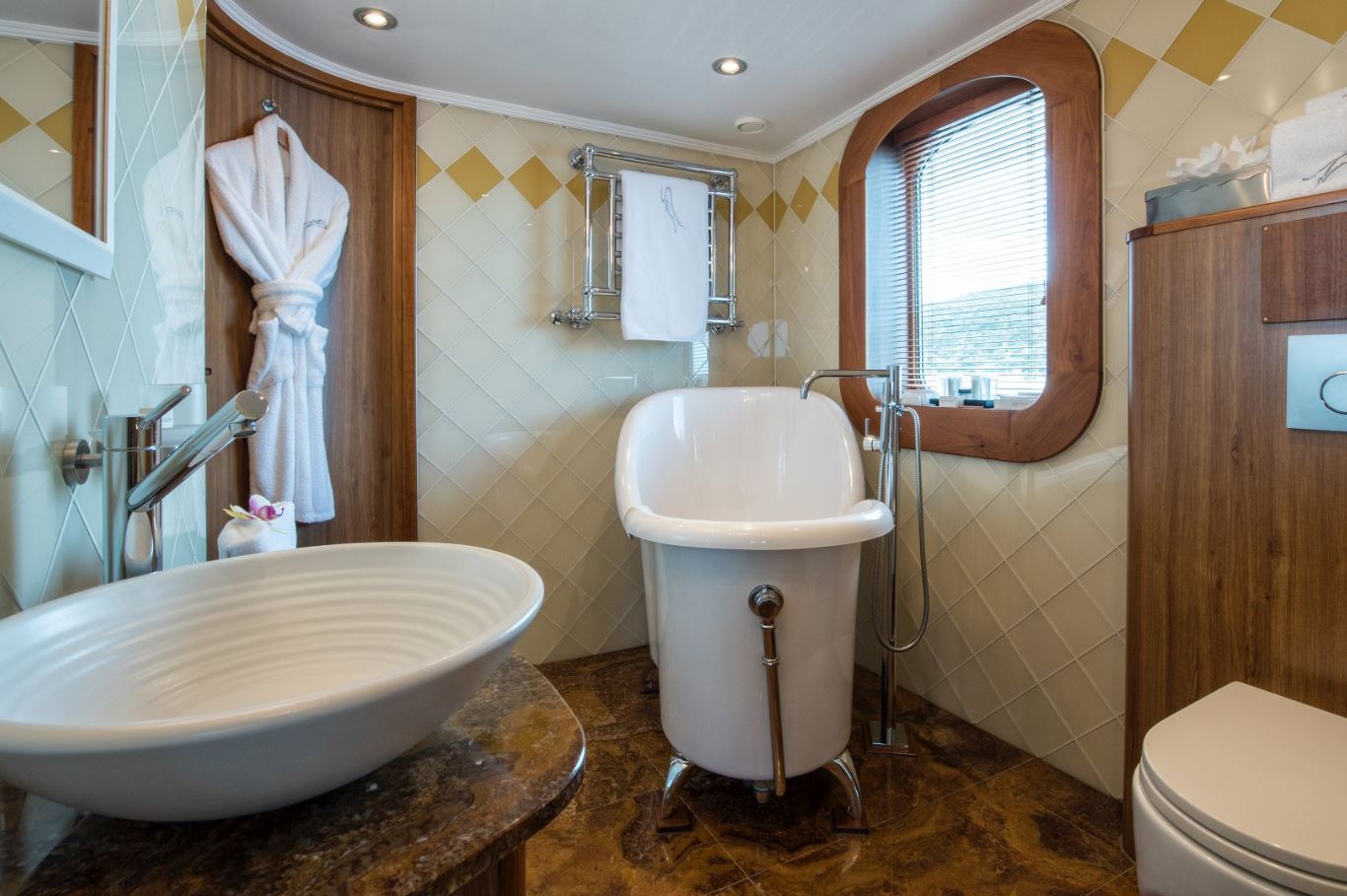 Few of her unique features onboard are such as the dining salon for all 26 guests sits in a colossal 7m atrium that is bathed in natrual light filtered down trhough the glass bottomed 18-person Jacuzzi above. She has a fully equipped SPA with gym facilities, indoor Jacuzzi, steam room and sauna, even a dedicated beauty salon/massage room with fully trained therapist onboard.