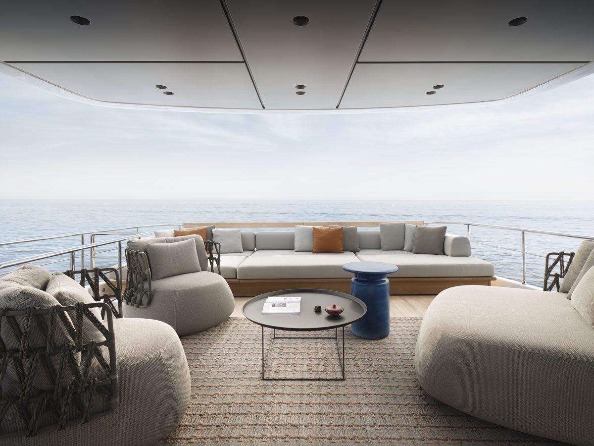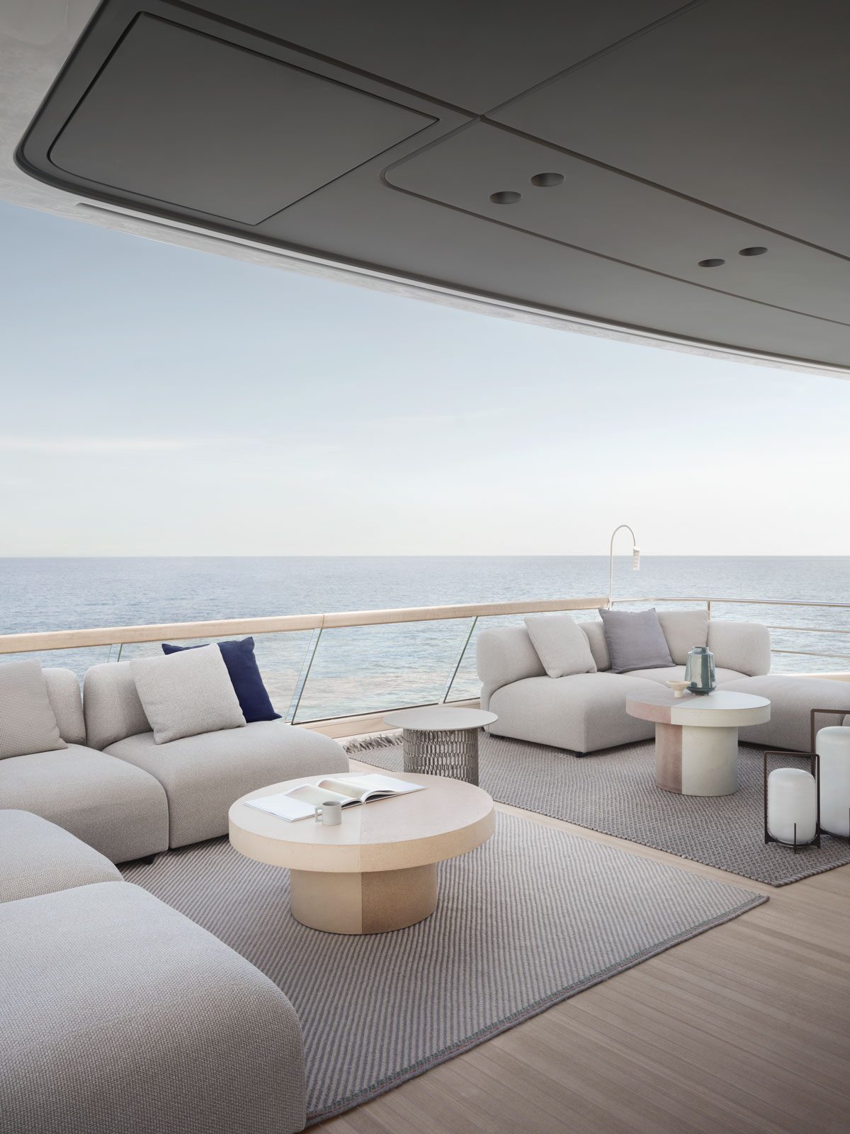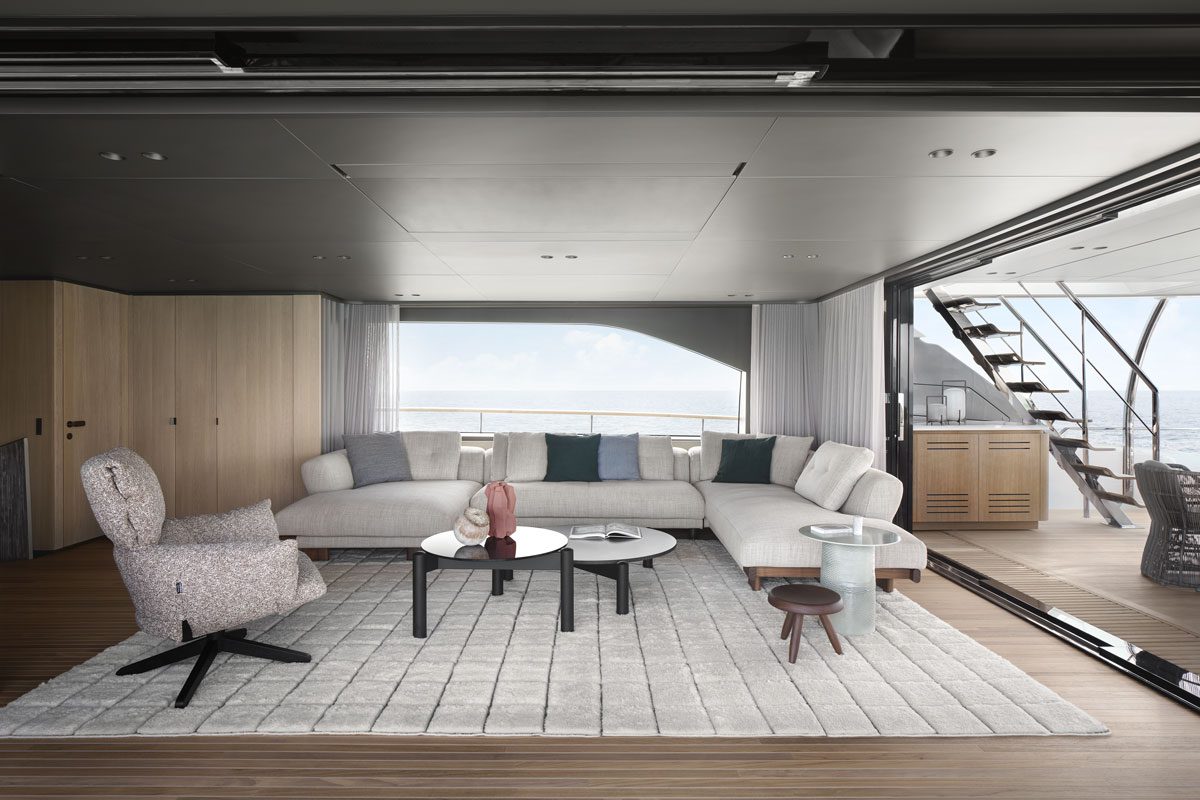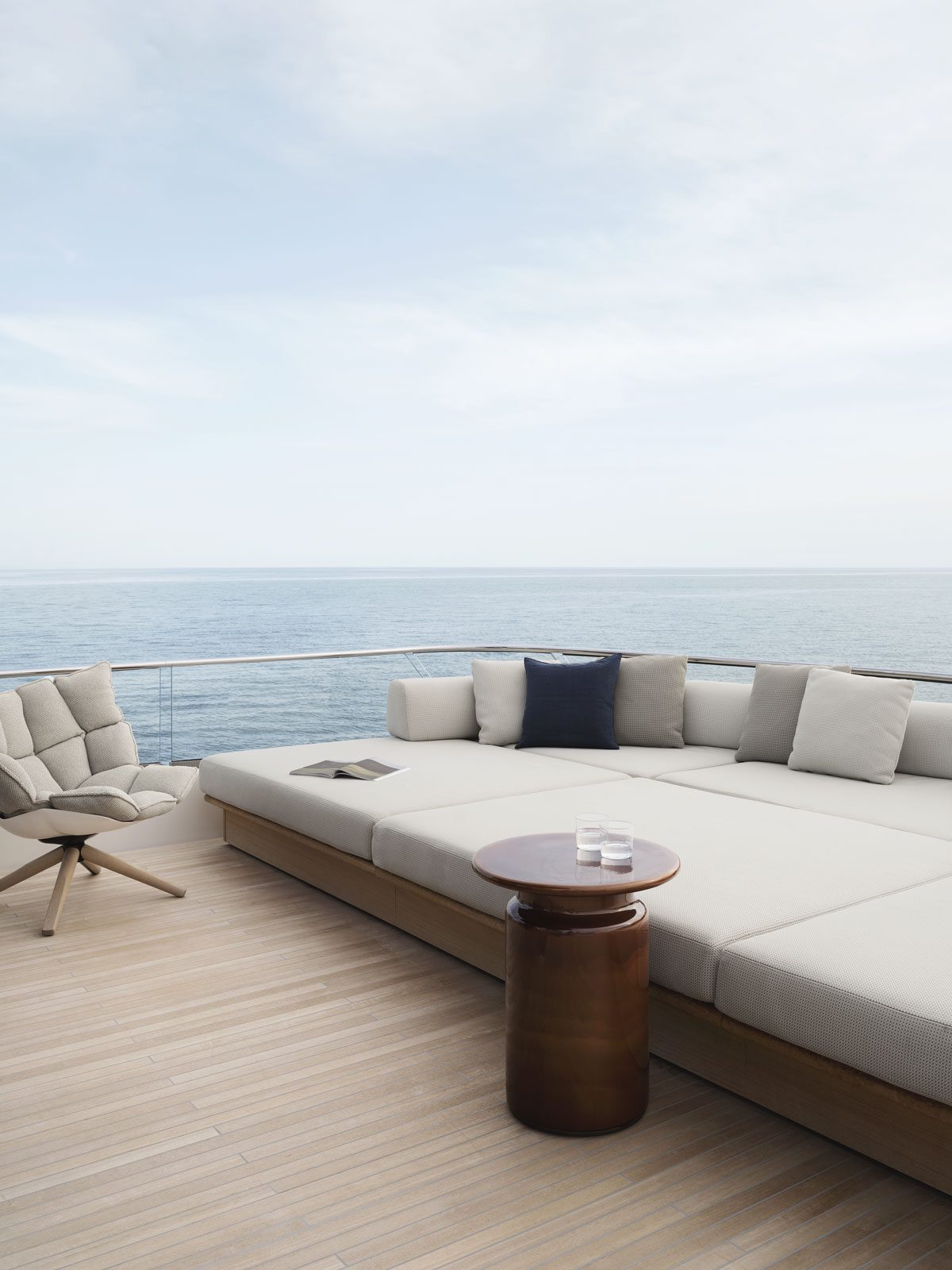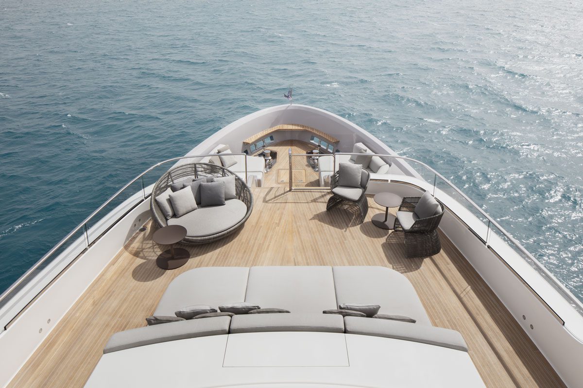 The upper deck has an asymmetrical configuration which guarantees greater space, comfort and a direct view of the sea from both sides, providing total indoor-outdoor connection.