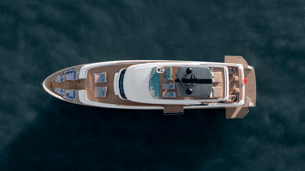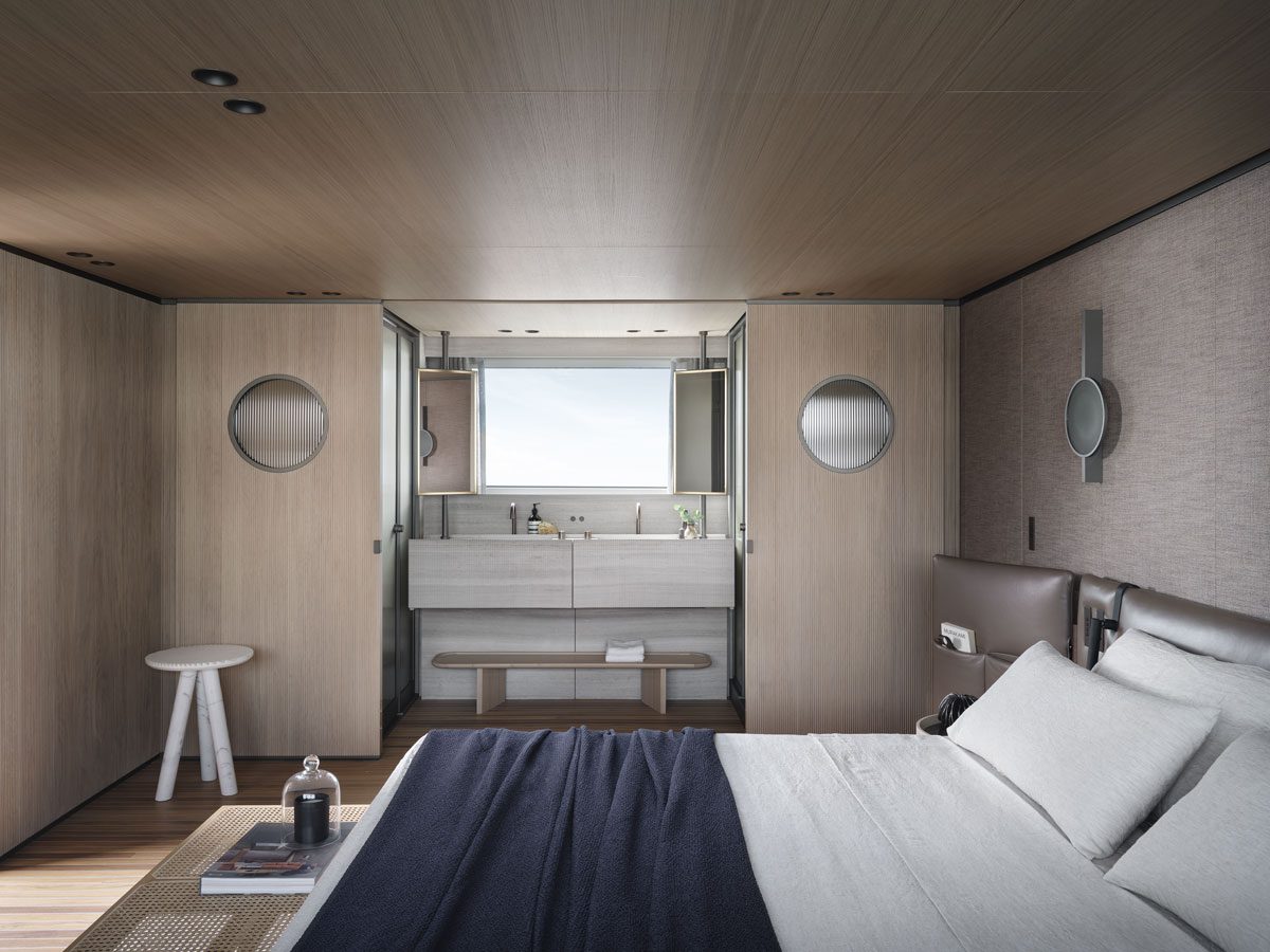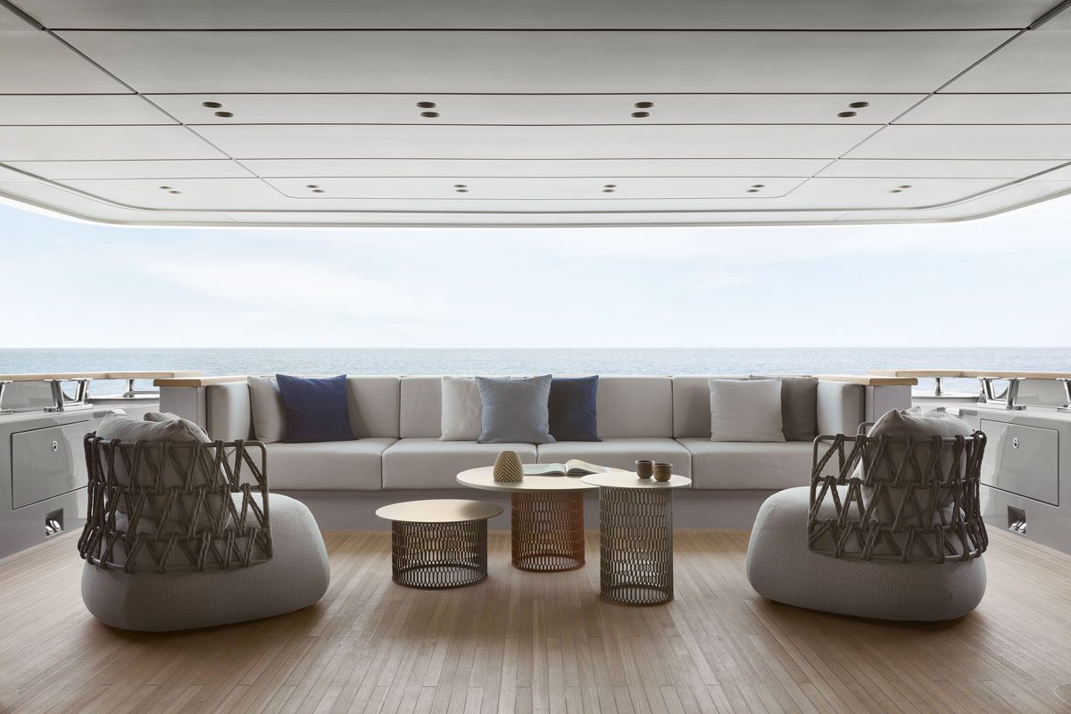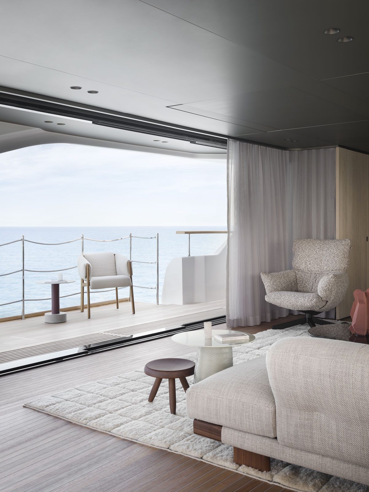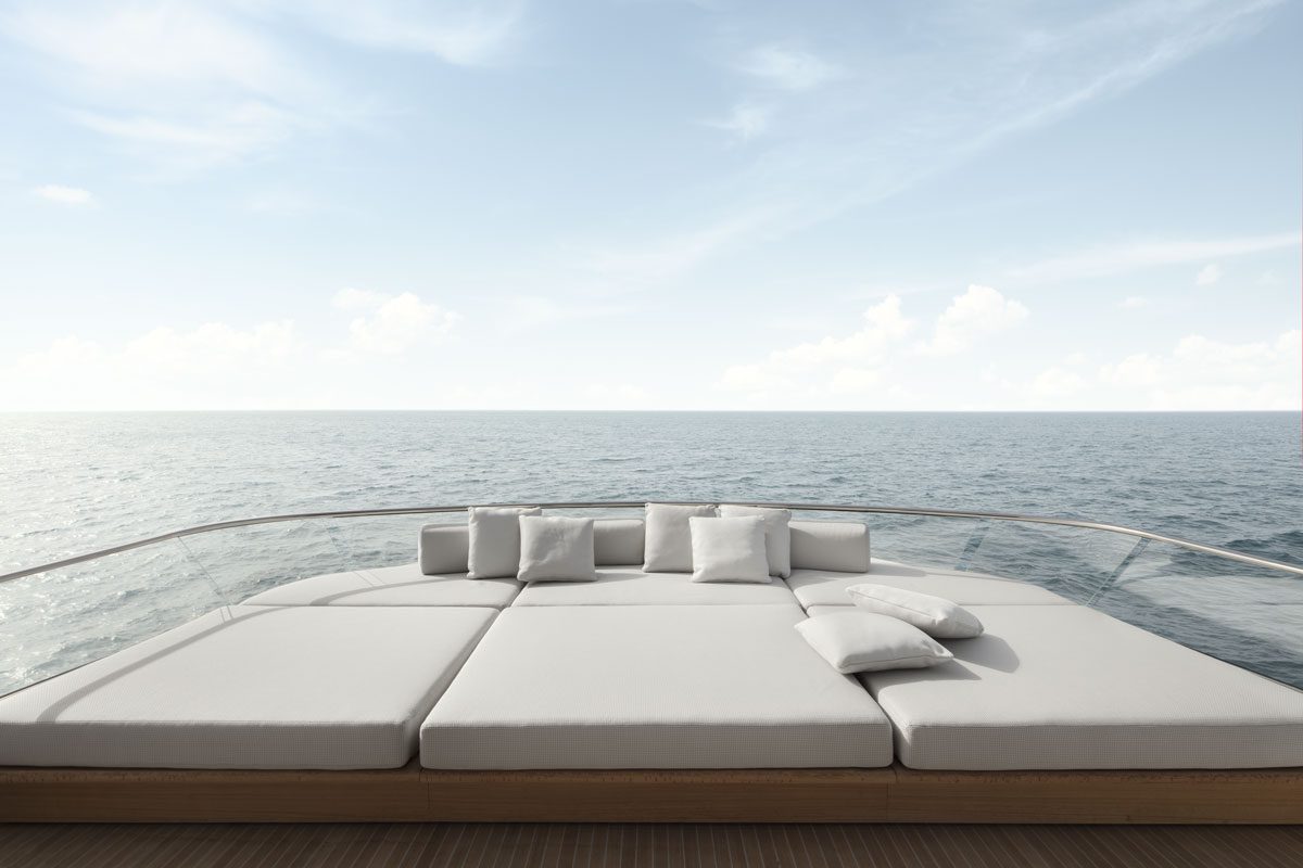 The upper deck has an asymmetrical configuration which guarantees greater space, comfort and a direct view of the sea from both sides, providing total indoor-outdoor connection.