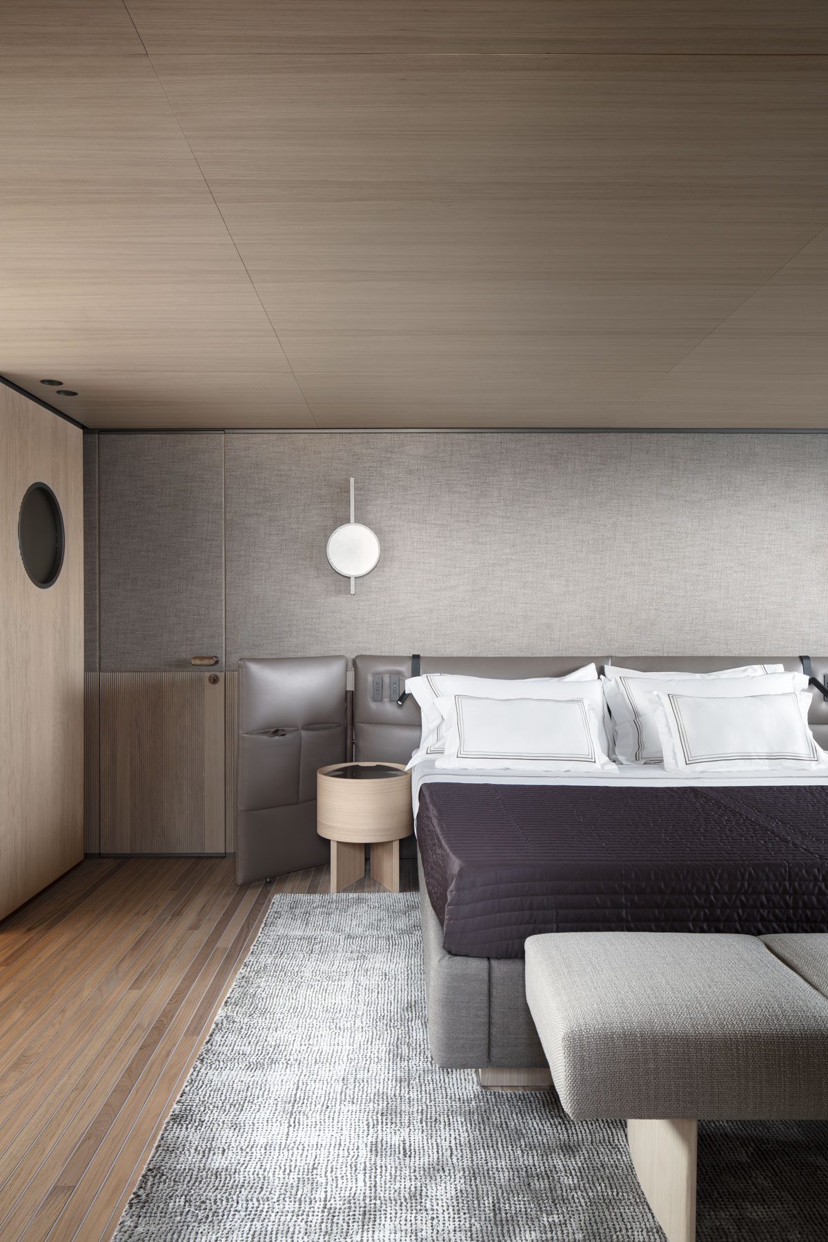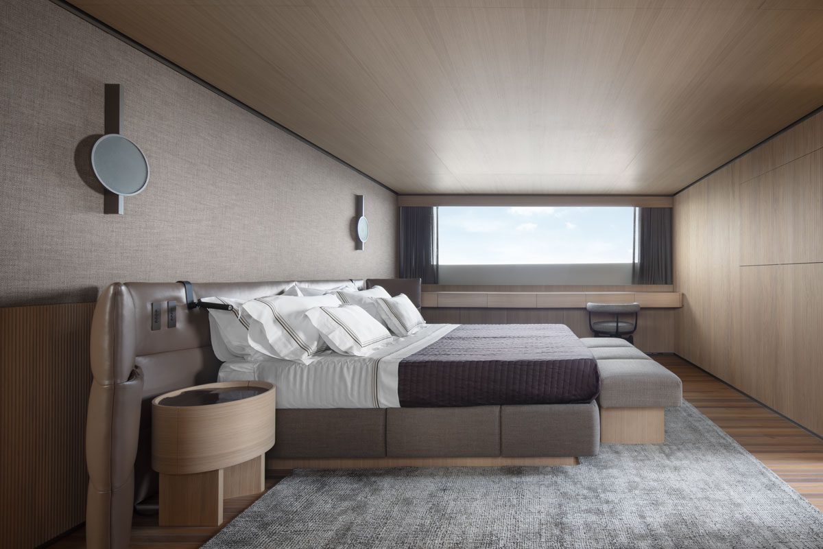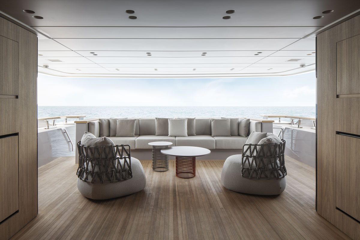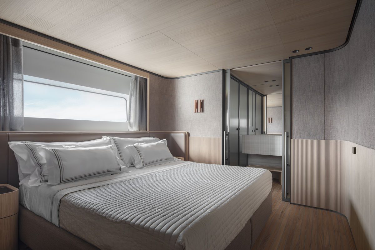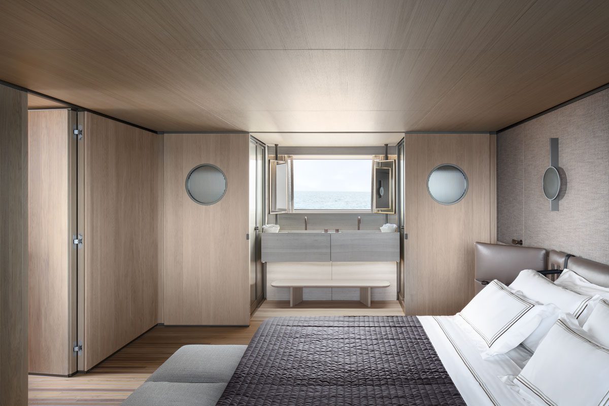 The upper deck has an asymmetrical configuration which guarantees greater space, comfort and a direct view of the sea from both sides, providing total indoor-outdoor connection.