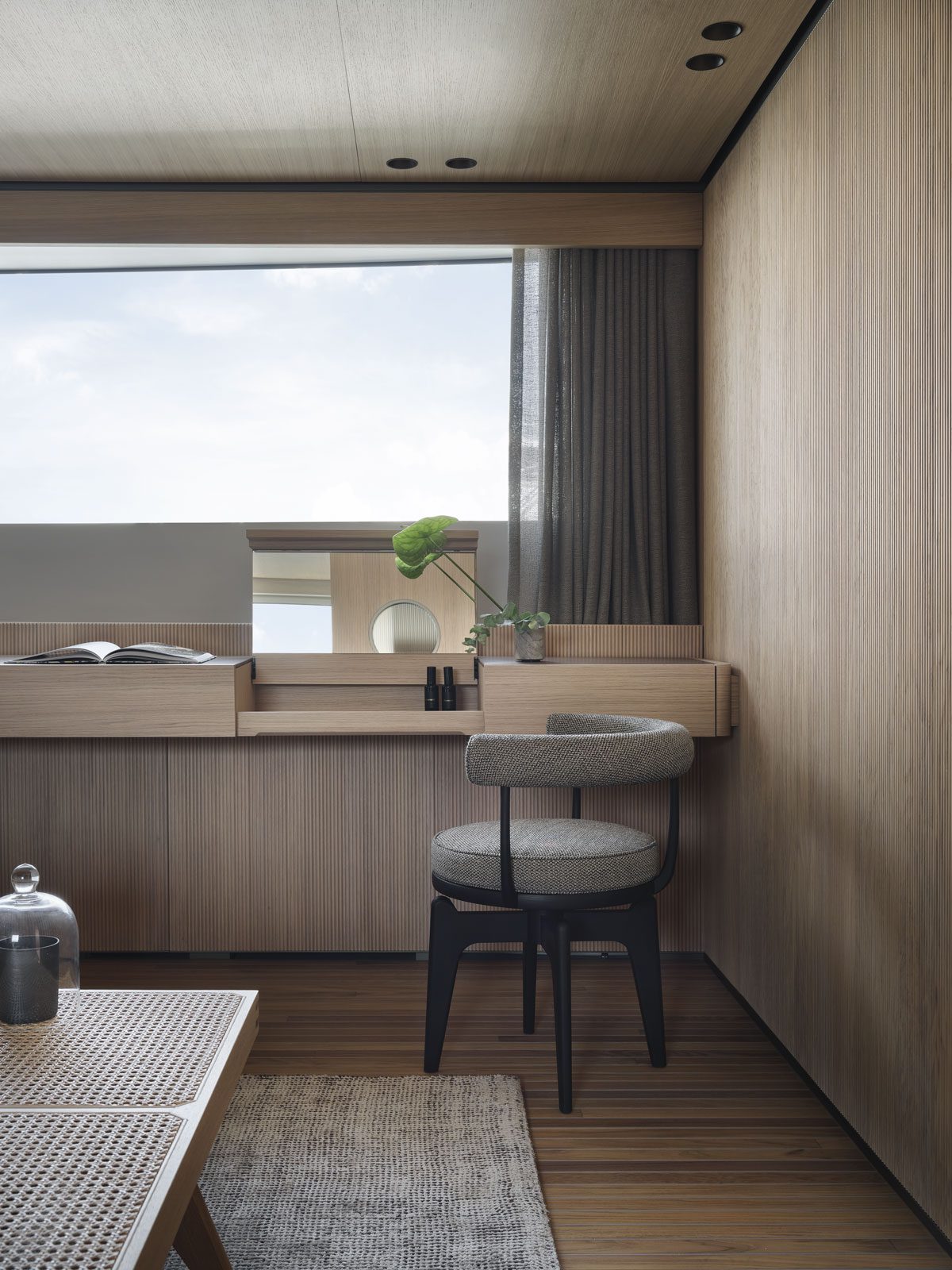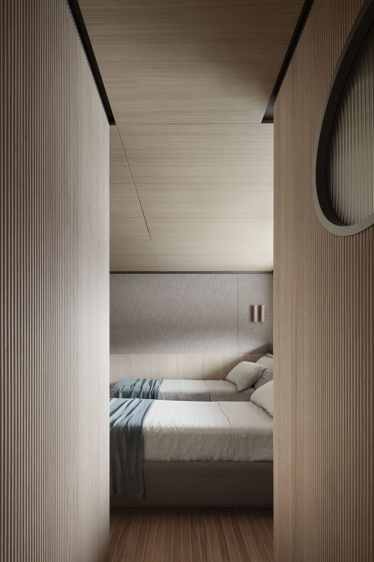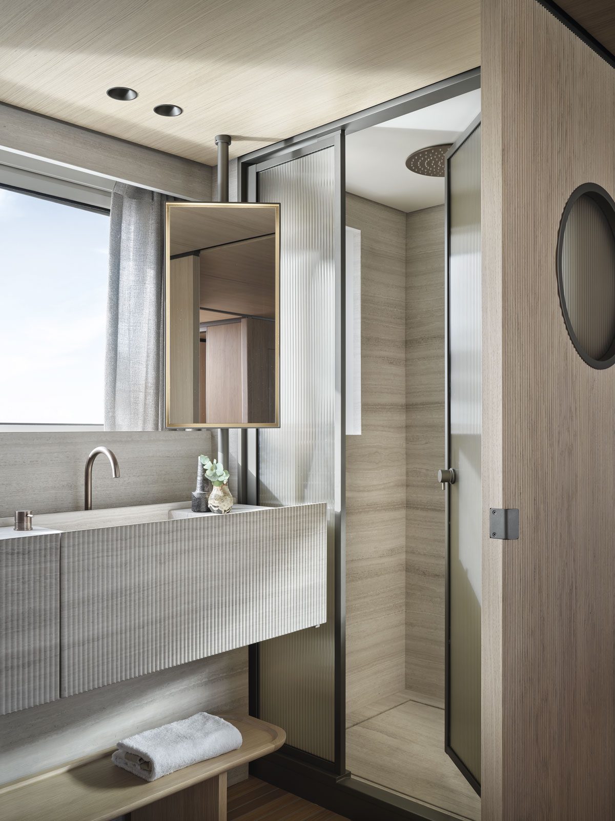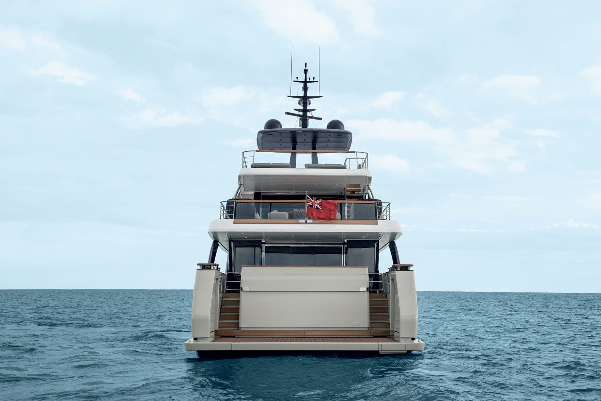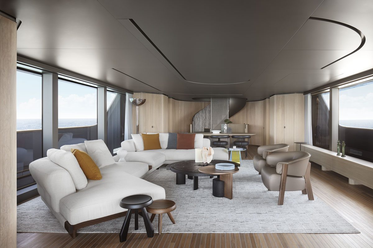 The upper deck has an asymmetrical configuration which guarantees greater space, comfort and a direct view of the sea from both sides, providing total indoor-outdoor connection.