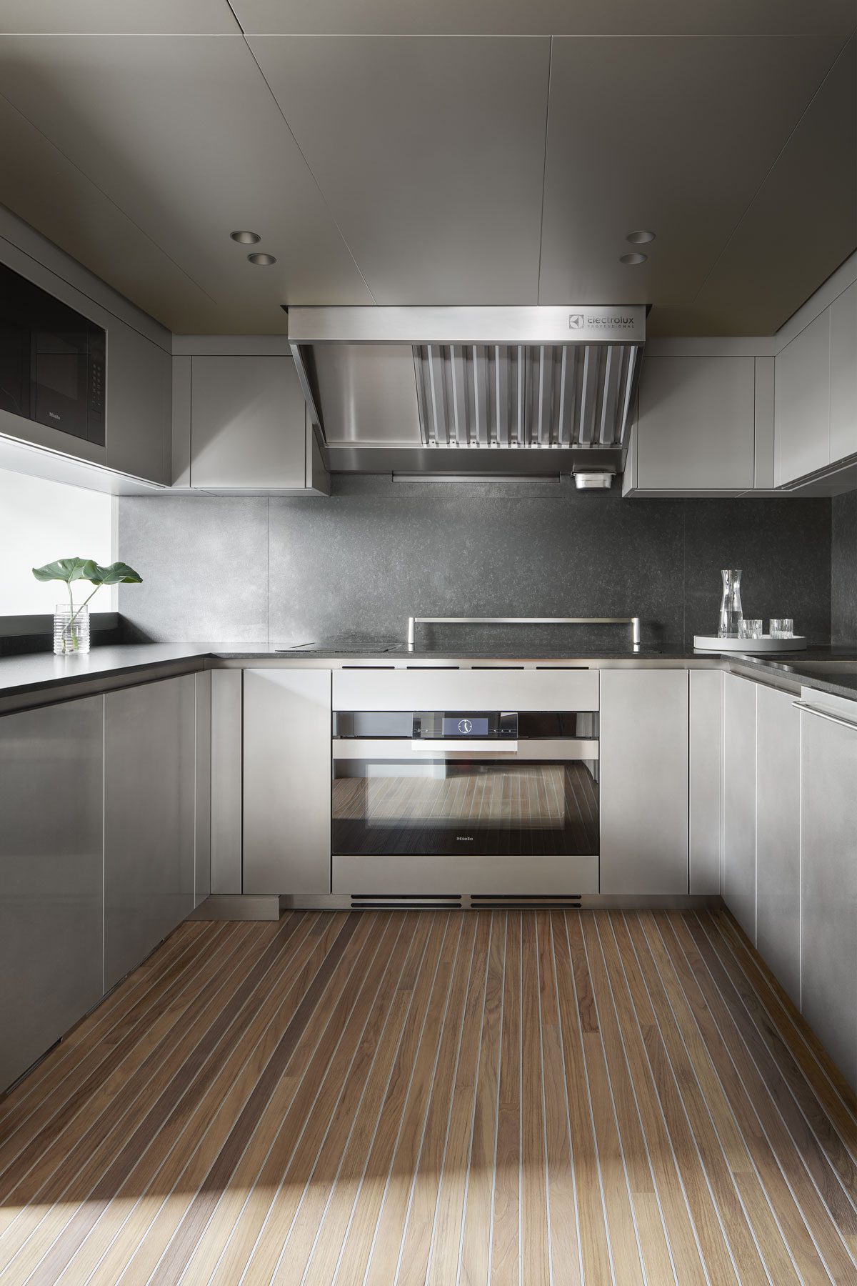 A spacious and extended stern area can be transformed into a swim platform of 19 square meters when the yacht is at anchor thanks to large lateral hatches that open to permit diving and sunbathing au bord de l’eau.