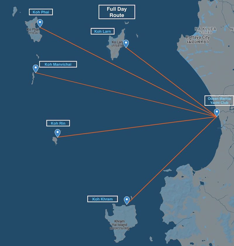 Koh Larn – is the largest nearby Island off the south of Pattaya. The only Island where you can stay overnight, with accommodation. Food and drinks are available on the Island. Time of travel from Ocean Marina 1 hour. No entrance fee is charged.