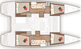 With two double cabins that share a head and a large stall shower and two single beds in both bow compartments. This Lagoon 42 K-35 is able to accommodate 12 guests for bareboat charters, or 10 guests with 2 crew.