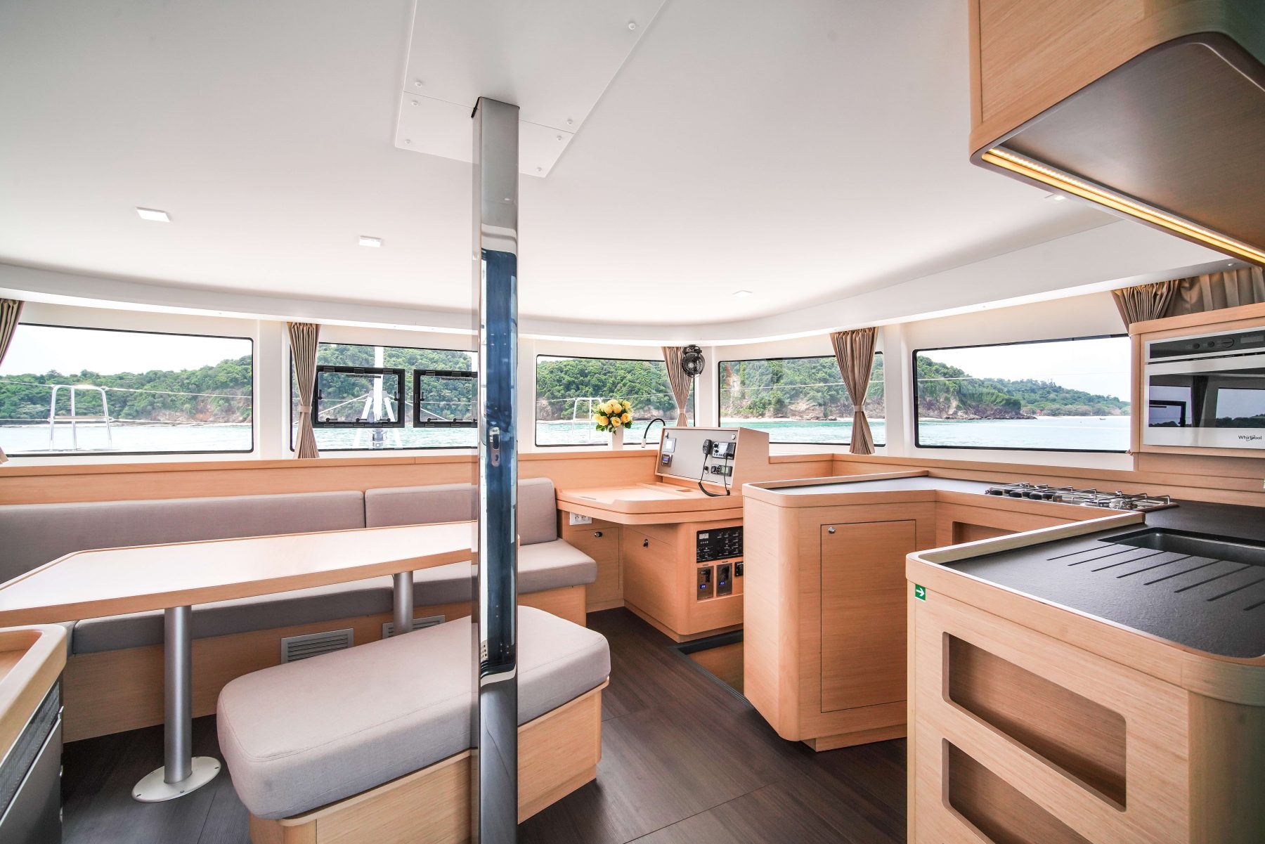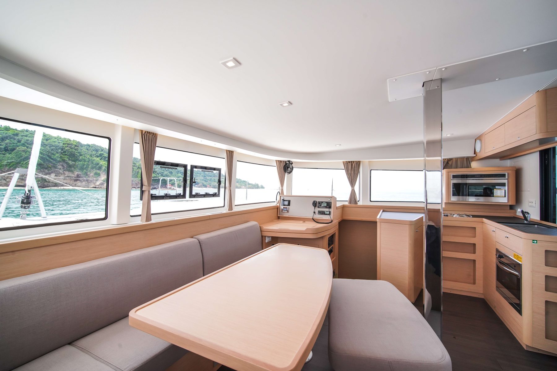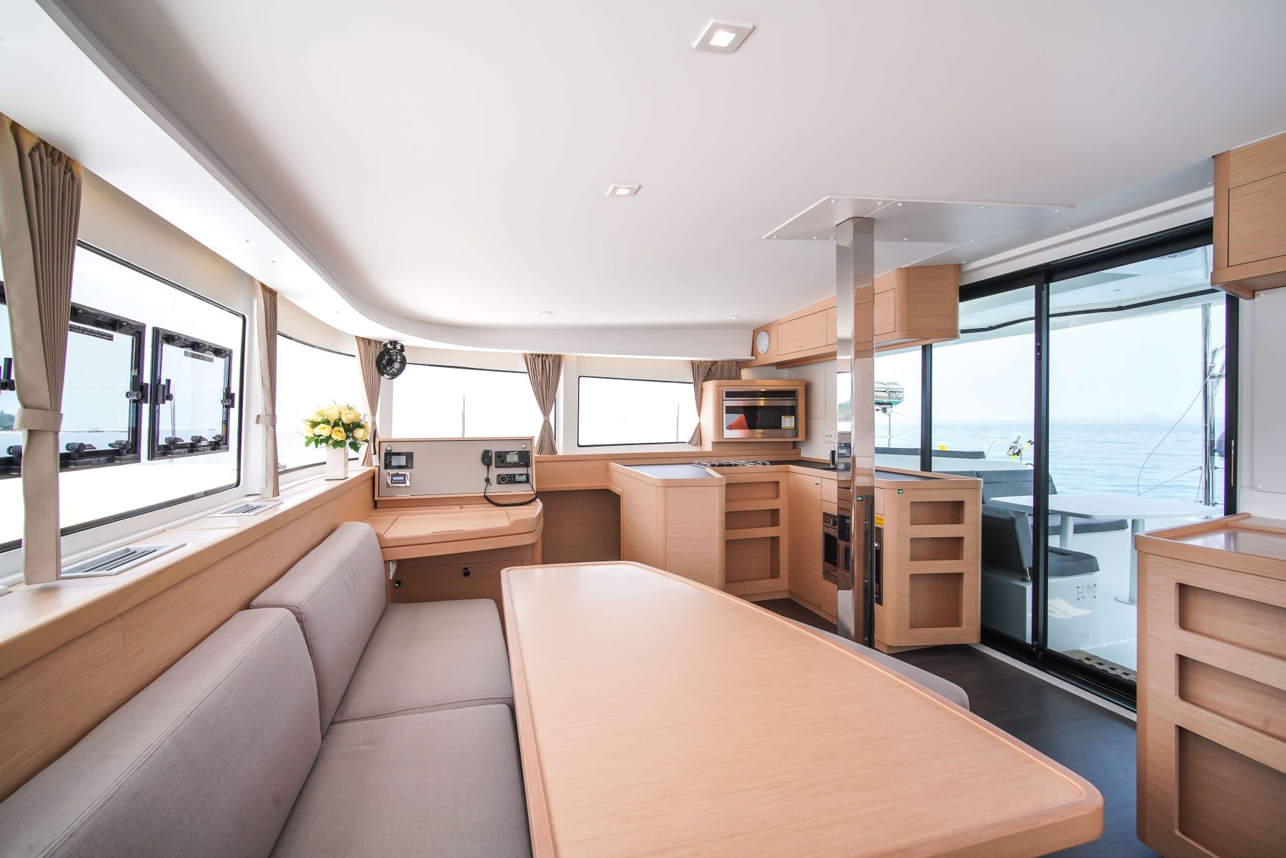 A three-panel glass door leads seamlessly from the cockpit to the saloon located on the same level. The saloon is spacious and easy to move around. The L-shaped settee runs athwartships and also serves as a seat for the outboard-facing navigation station; this salon settee can be easily converted into a double berth to accommodate eight guests sleeping on board. The U-shaped galley is split, with a three-burner Eno stove and a single sink to starboard and refrigeration to port. The top-loading fridge is just at the edge of the stairs to the port hull.