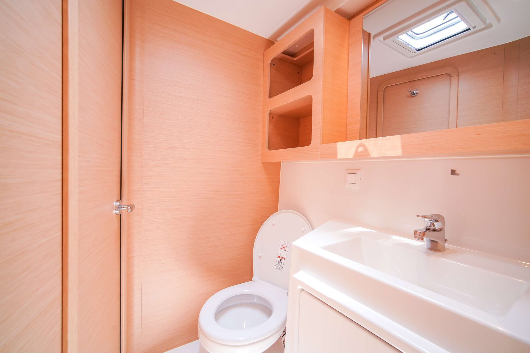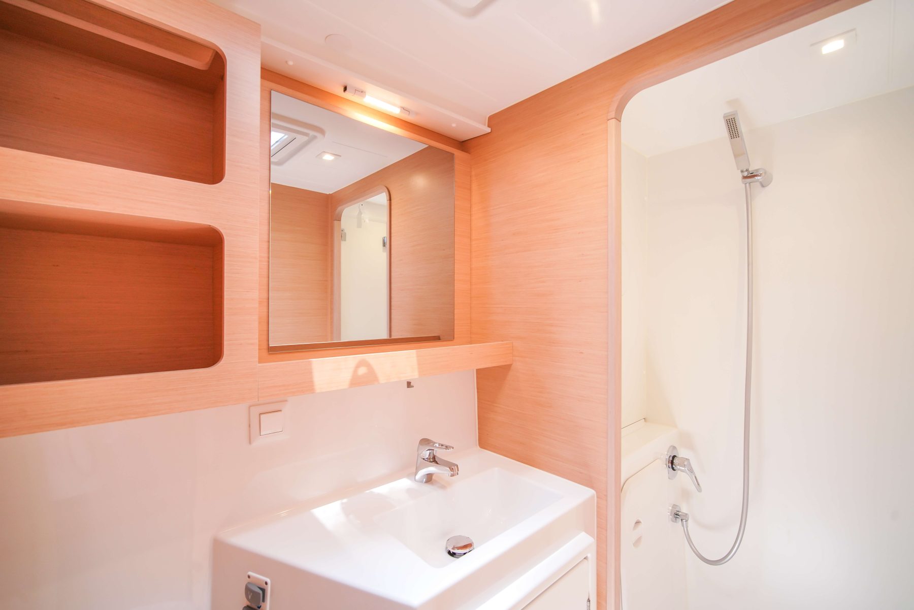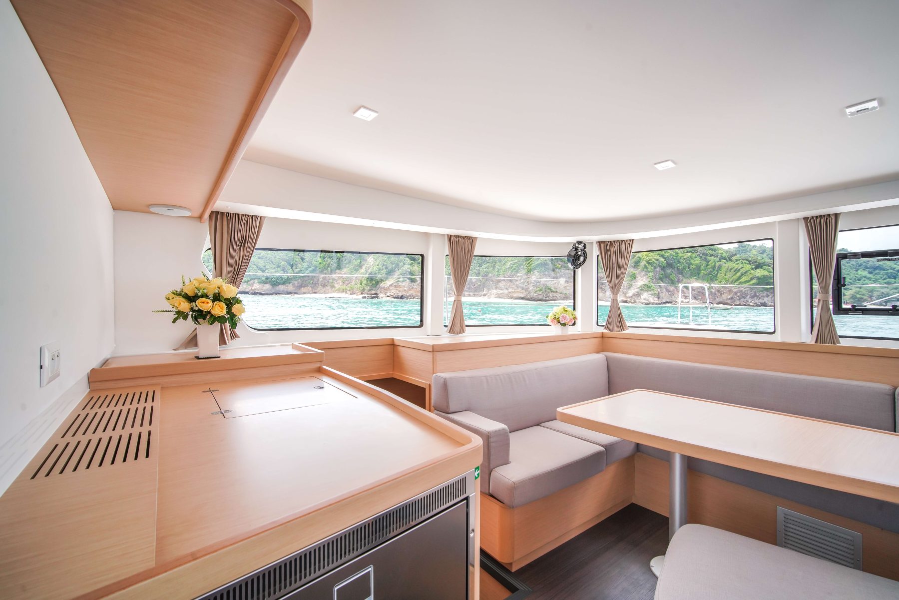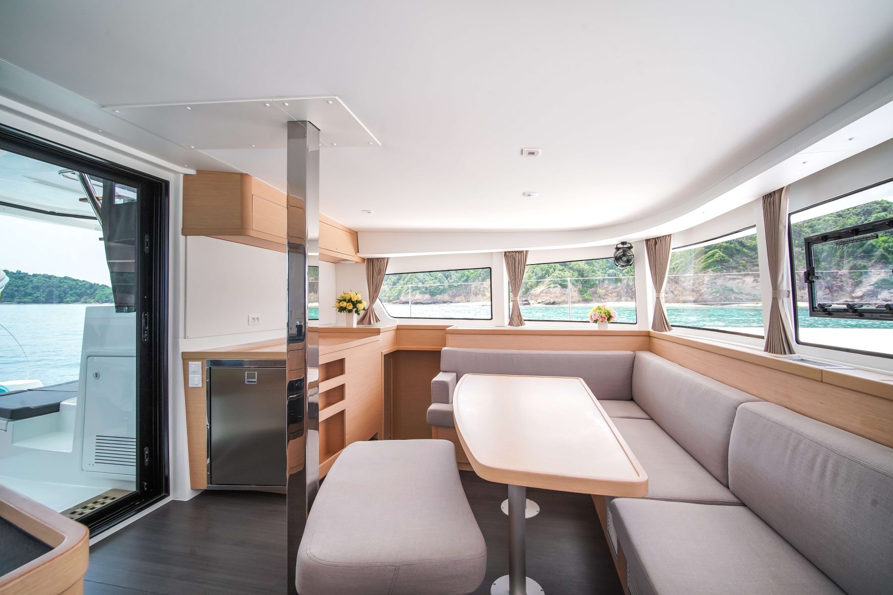 A three-panel glass door leads seamlessly from the cockpit to the saloon located on the same level. The saloon is spacious and easy to move around. The L-shaped settee runs athwartships and also serves as a seat for the outboard-facing navigation station; this salon settee can be easily converted into a double berth to accommodate eight guests sleeping on board. The U-shaped galley is split, with a three-burner Eno stove and a single sink to starboard and refrigeration to port. The top-loading fridge is just at the edge of the stairs to the port hull.